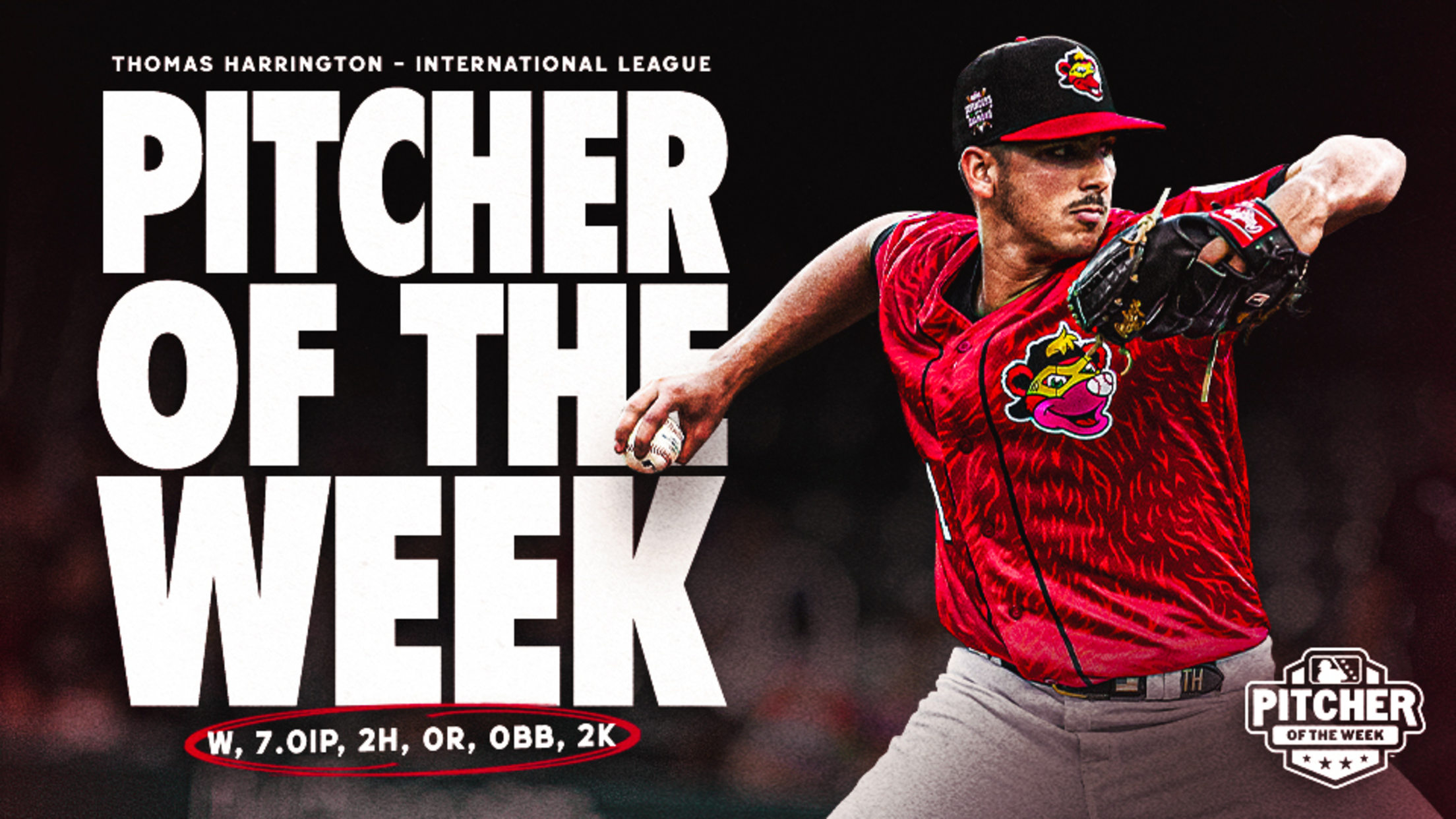 INDIANAPOLIS – Minor League Baseball and the Indianapolis Indians today announced that the Pittsburgh Pirates No. 5 prospect according to MLB Pipeline, right-handed pitcher Thomas Harrington, has been named the International League Pitcher of the Week after allowing just two baserunners over 7.0 shutout innings on Aug. 17.