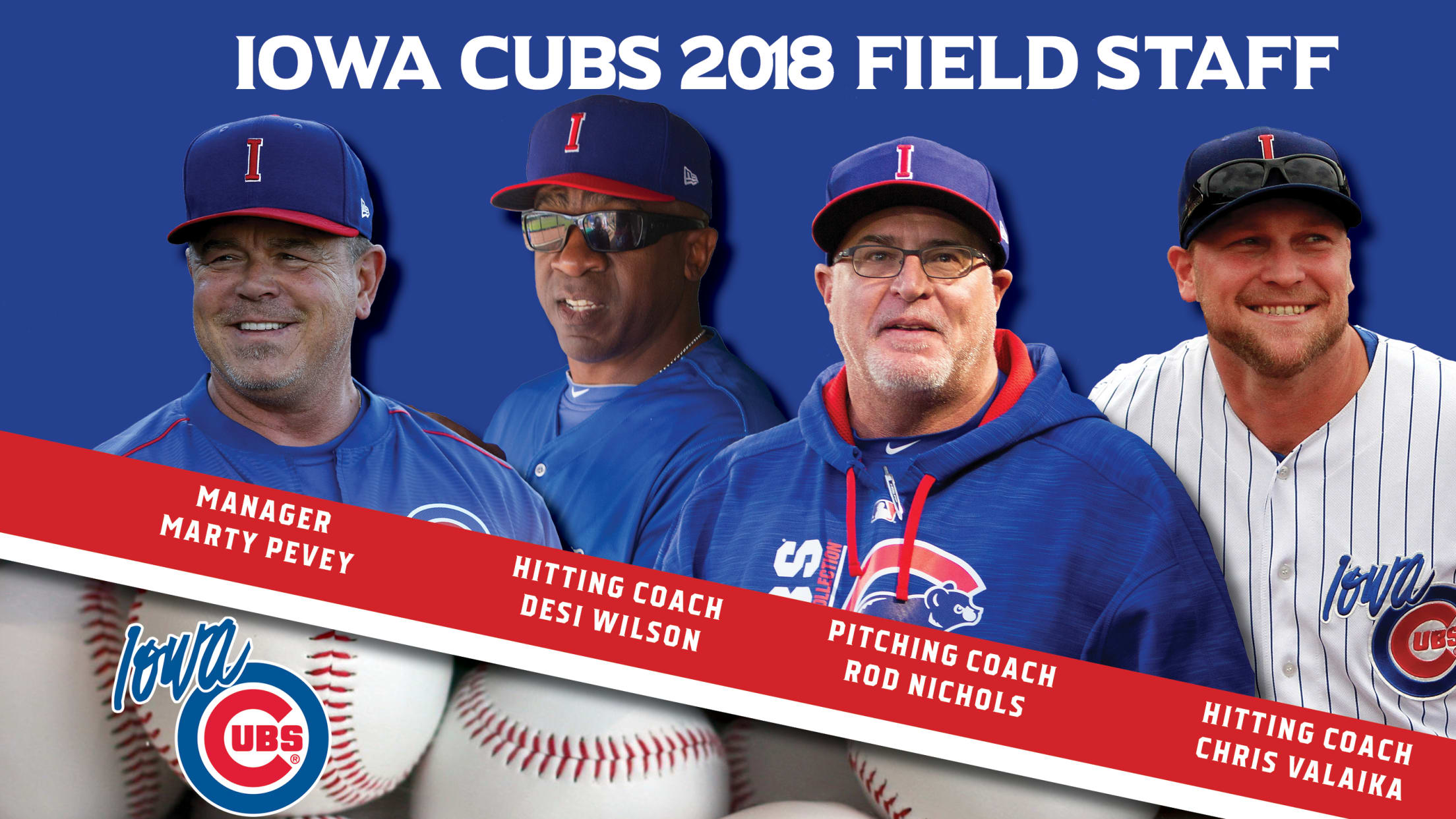The Chicago Cubs today unveiled Iowa's field staff for 2018, led for the sixth consecutive season by Manager Marty Pevey. Pitching coach Rod Nichols, hitting coach Desi Wilson and strength and conditioning coach Ryan Clausen also return from the 2017 staff. Former I-Cub Chris Valaika returns to Des Moines to