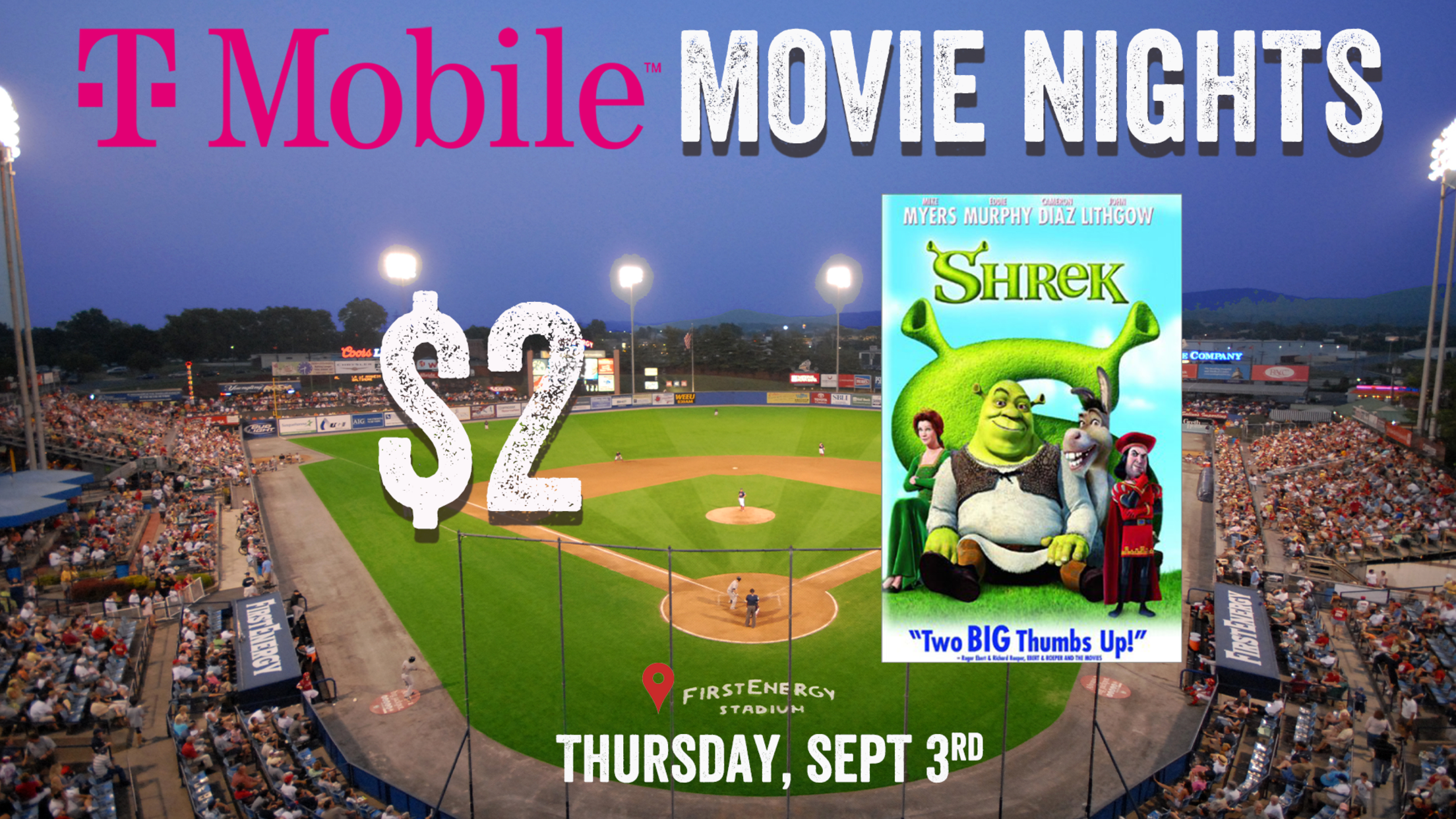 On Thursday, September 3, the Fightin’s will feature Shrek (PG). “Once upon a time, in a far away swamp, there lived an ogre named Shrek whose precious solitude is suddenly shattered by an invasion of annoying fairy tale characters. They were all banished from their kingdom by the evil Lord Farquaad. Determined to save their home, Shrek cuts a deal with Farquaad and sets out to rescue Princess Fiona to be Farquaad's bride. Rescuing the Princess may be small compared to her deep, dark secret.”