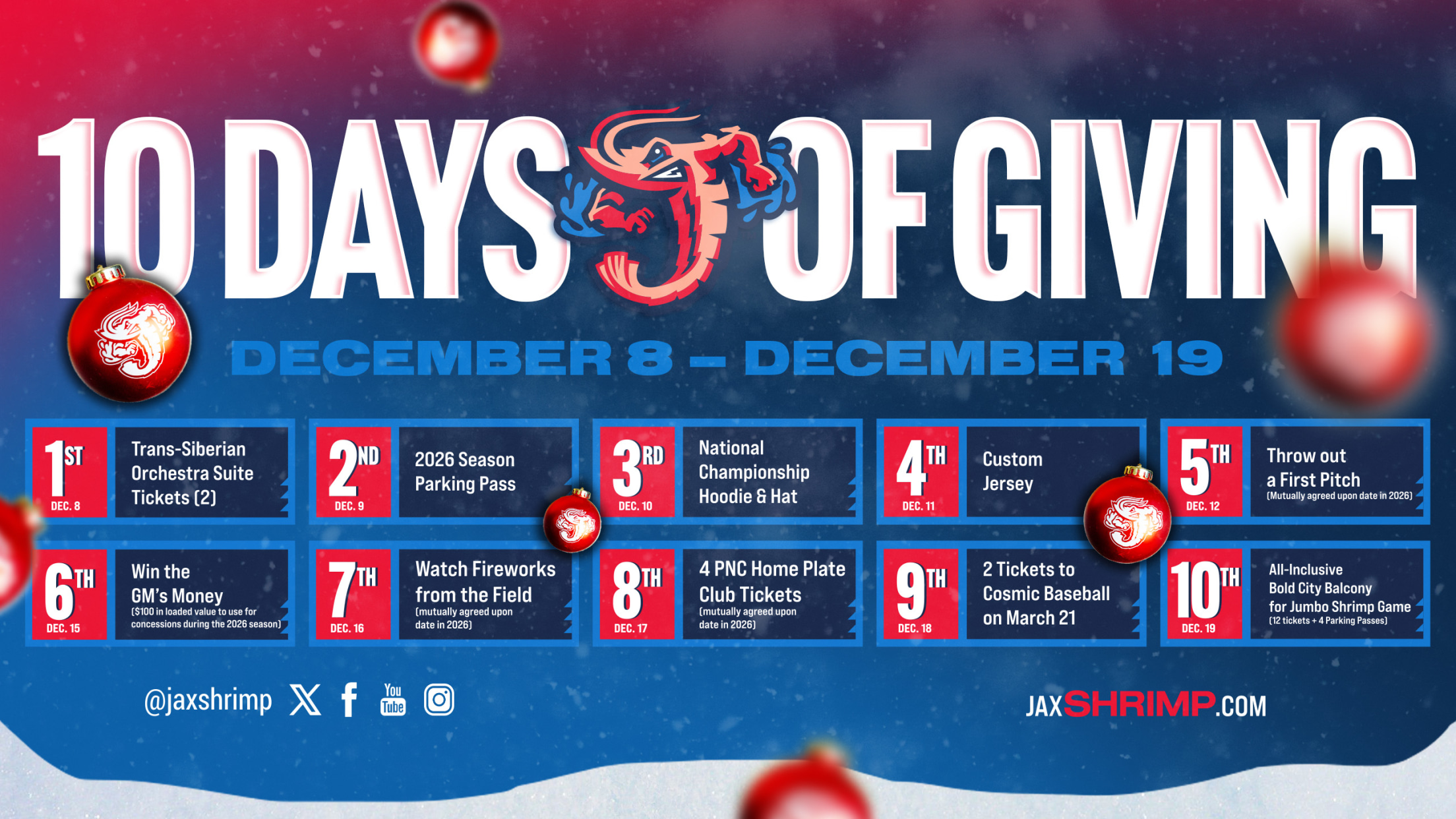 JACKSONVILLE, Fla. – The Jacksonville Jumbo Shrimp are celebrating the holiday season with 10 Days of Giving, the club’s annual two-week promotion that awards memorabilia and experience-based prizes for 2026 home games. This year’s rewards include watching fireworks from the field, ceremonial first pitch, PNC Homeplate Club seats, 2026 season