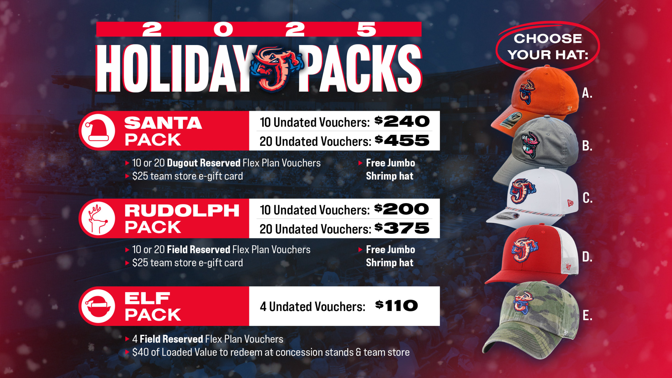 JACKSONVILLE, Fla. – The Jacksonville Jumbo Shrimp are providing the perfect gift and stocking stuffer for the 2025 holiday season. Fans have the choice of three different holiday packages that feature undated ticket vouchers for the 2026 season. While one holiday package includes tickets to the Jumbo Shrimp Hot Stove