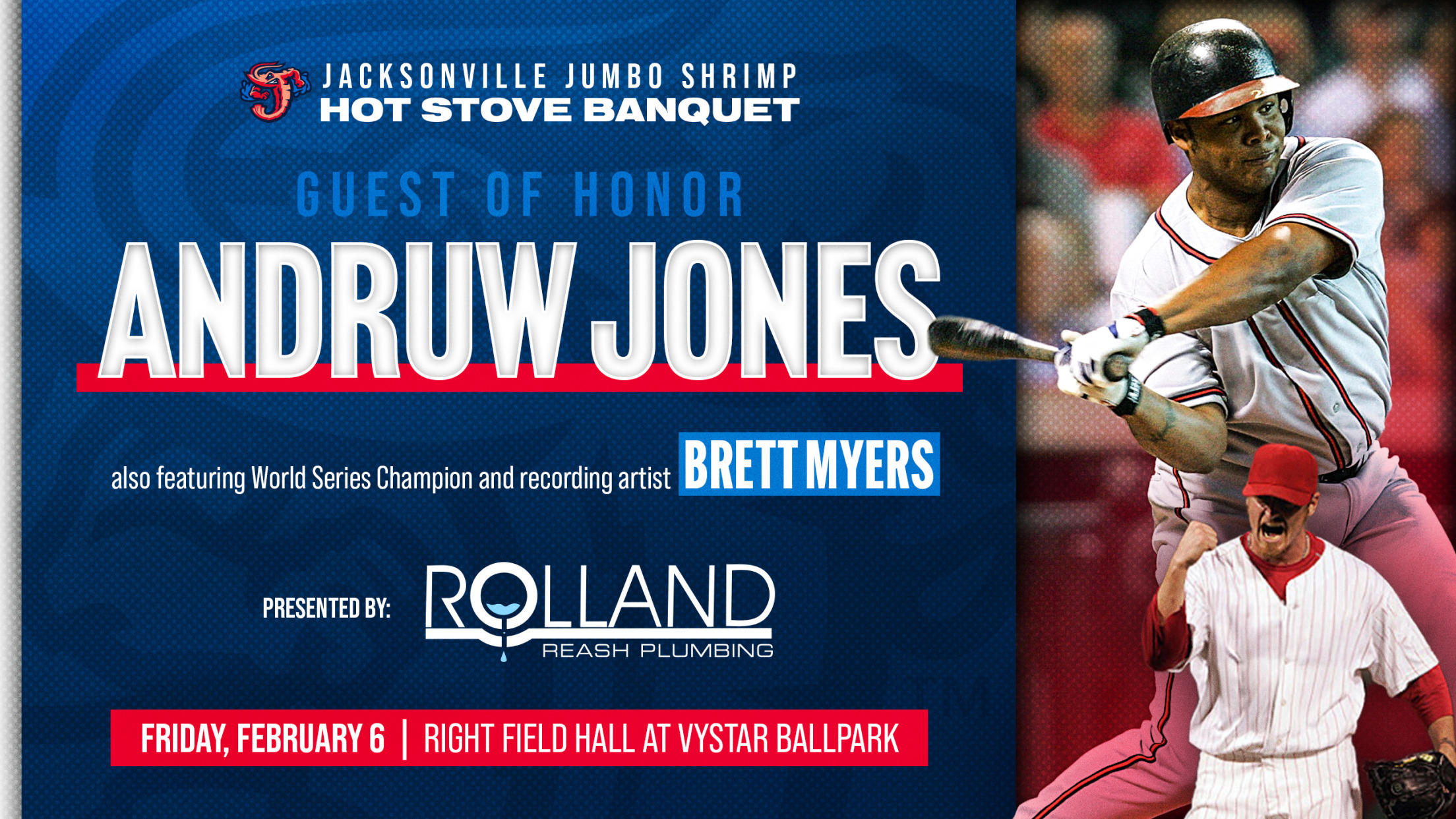 JACKSONVILLE, Fla. – Atlanta Braves legend Andruw Jones will be the guest of honor at the Jacksonville Jumbo Shrimp’s inaugural Hot Stove Banquet also featuring World Series Champion and recording artist Brett Myers presented by Rolland Reash Plumbing, set for 6:30 p.m. on Friday, February 6 inside the Right Field