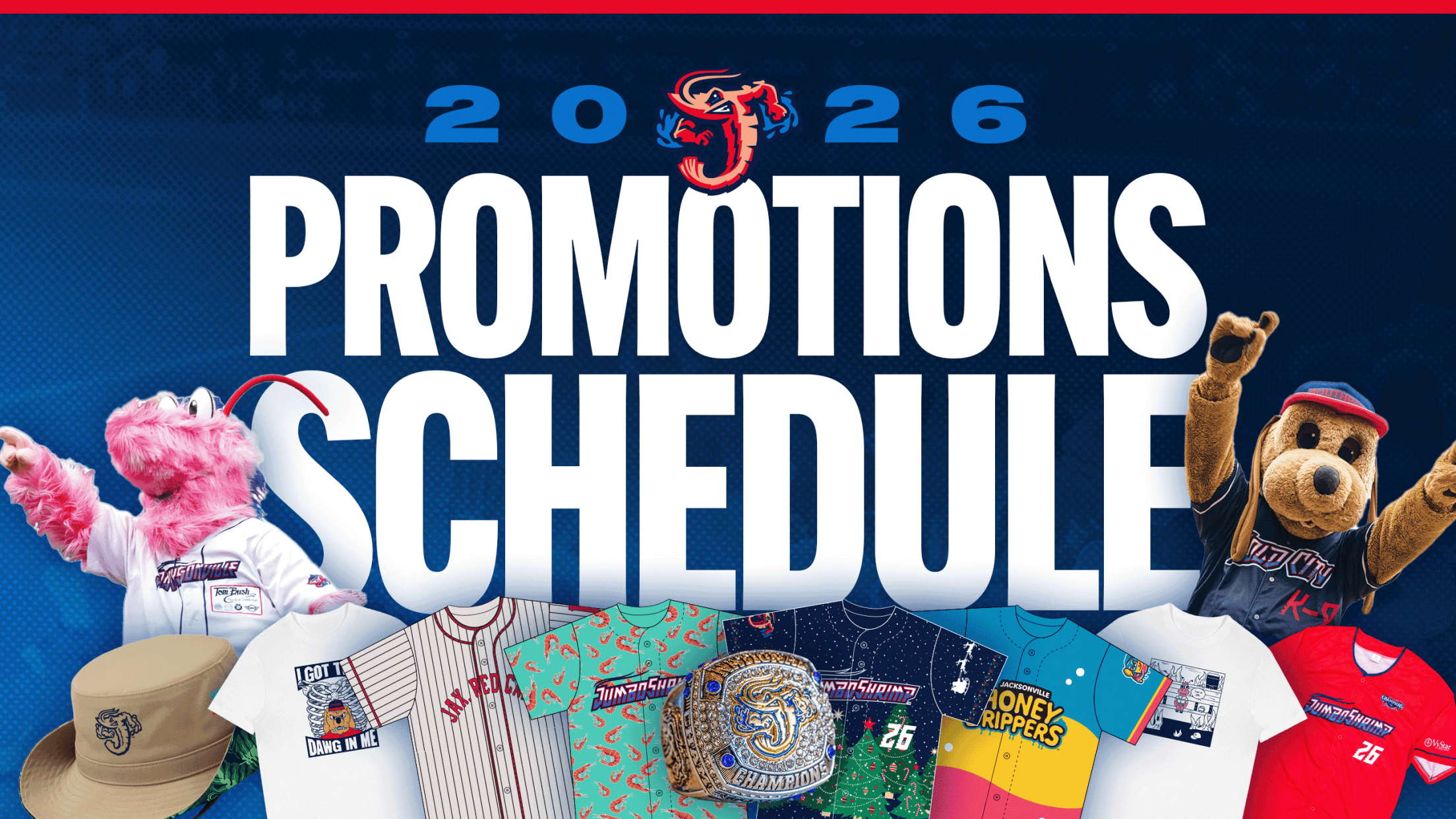 JACKSONVILLE, Fla. – Affordable Family Fun returns to VyStar Ballpark for the Jacksonville Jumbo Shrimp 2026 season in an enormous way with 24 fireworks dates, 21 giveaways, two Honey Drippers weekends, five Military Appreciation Nights, five Canines and Crustaceans Dog Days (plus one Cat Day) presentedi and the club’s can’t-miss