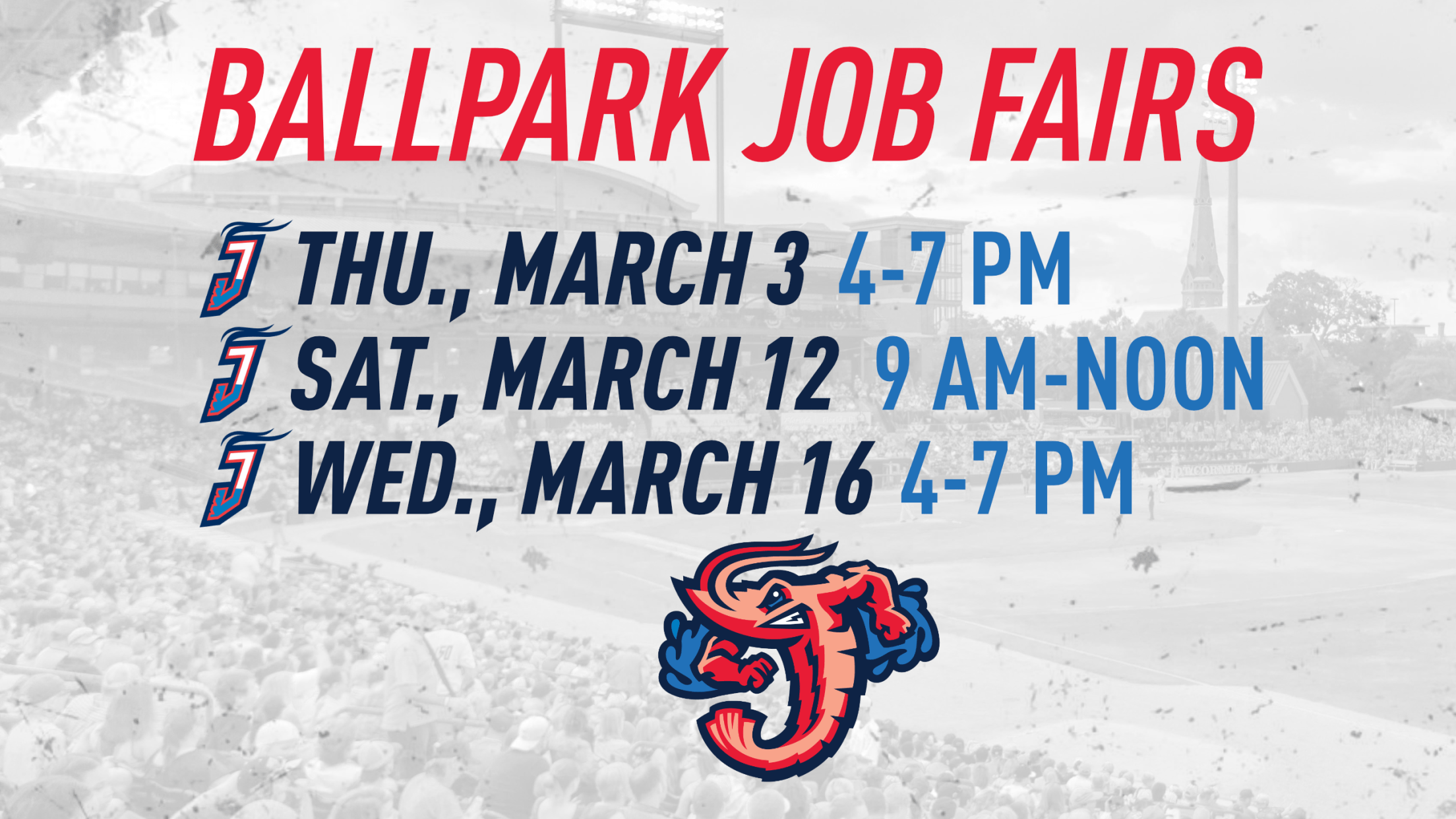 JACKSONVILLE, Fla. – The Jacksonville Jumbo Shrimp are building their team for another season of Affordable Family Fun at 121 Financial Ballpark. The club will hold three job fairs for 2022 game day positions from 4-7 p.m. on Thursday, March 3, 9 a.m.-noon on Saturday, March 12 and 4-7 p.m. on Wednesday, March 16 at the ballpark.