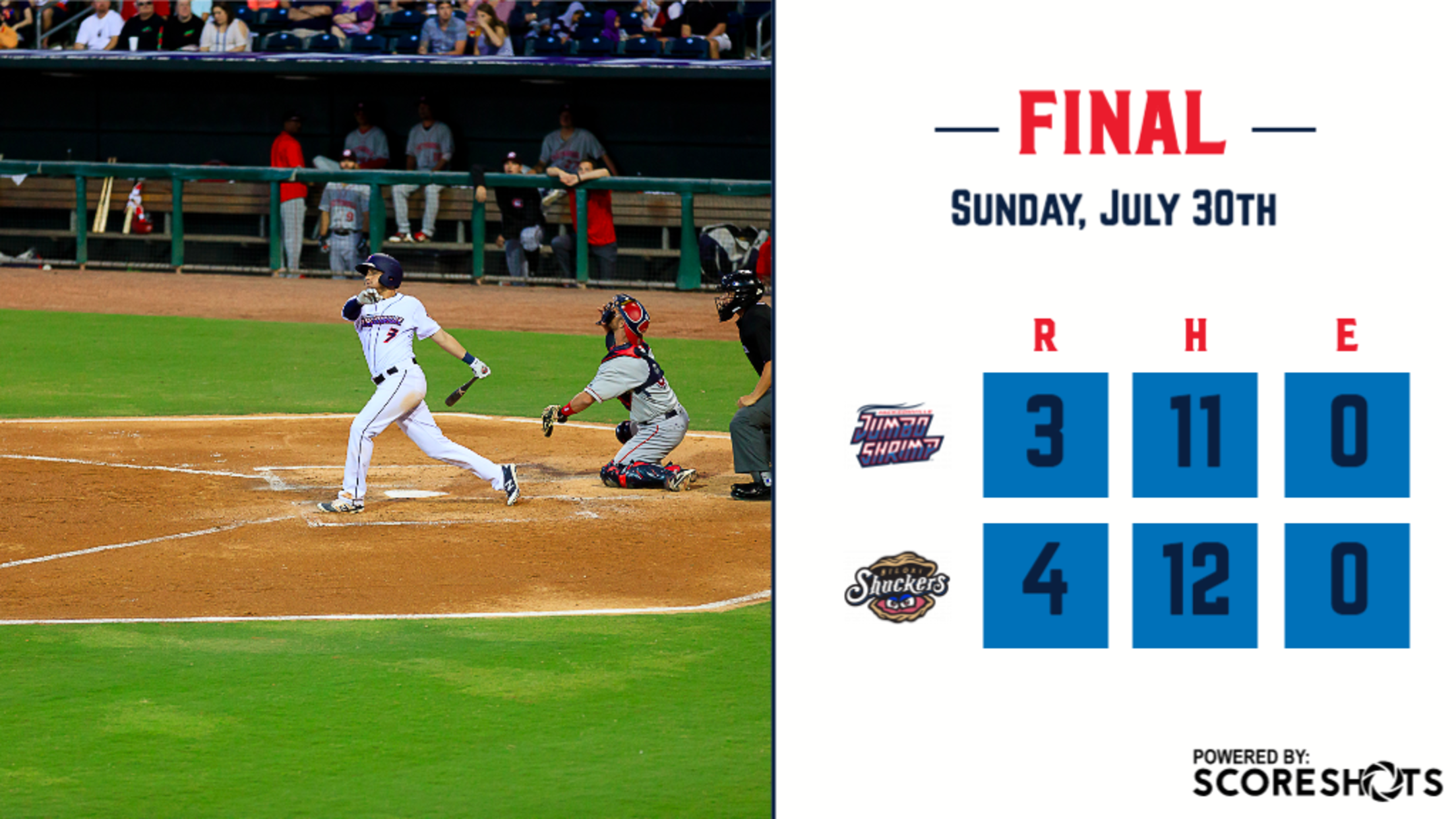 BILOXI, Miss. - The Jacksonville Jumbo Shrimp (18-18, 48-58) fell to the Biloxi Shuckers (15-21, 51-54) by a 4-3 score in the first game of the five-game series at MGM Park on Sunday night.