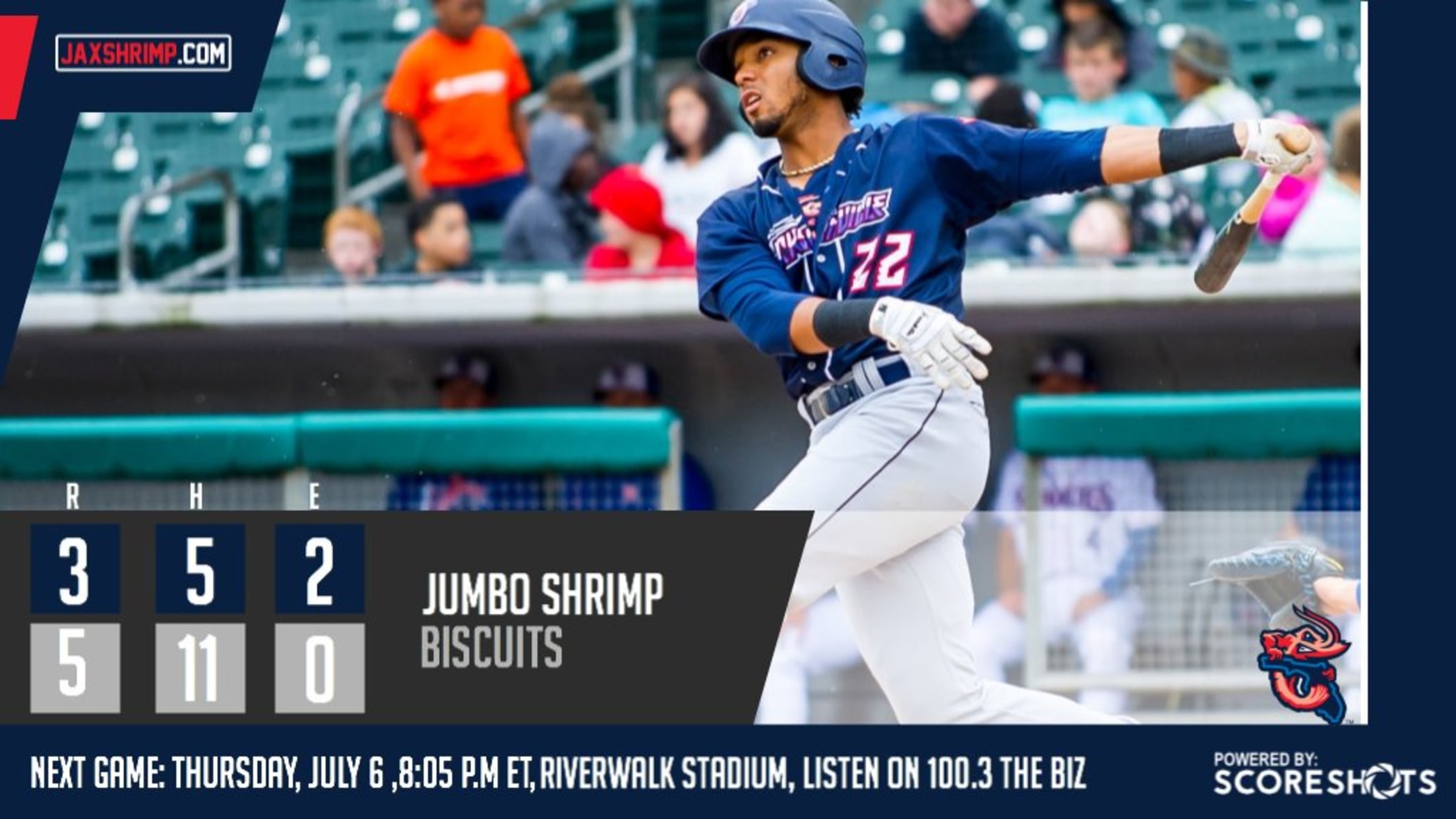 MONTGOMERY, Ala. - The Jacksonville Jumbo Shrimp (8-5, 38-45) fell to the Montgomery Biscuits (6-7, 43-40) by a 5-3 score in the second game of the five-game series at Montgomery Riverwalk Stadium on Wednesday night.