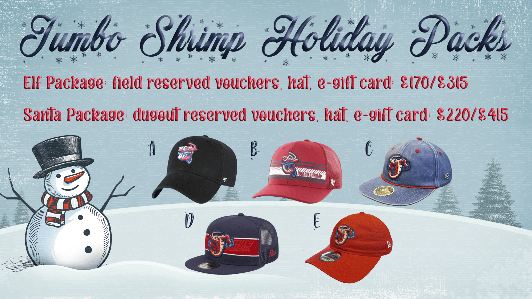 Fans have the choice of two different holiday packs that feature undated ticket vouchers for the 2023 season, an adjustable Jumbo Shrimp cap and a $25 e-gift card to the Jumbo Shrimp VyStar Credit Union Souvenir Store.
