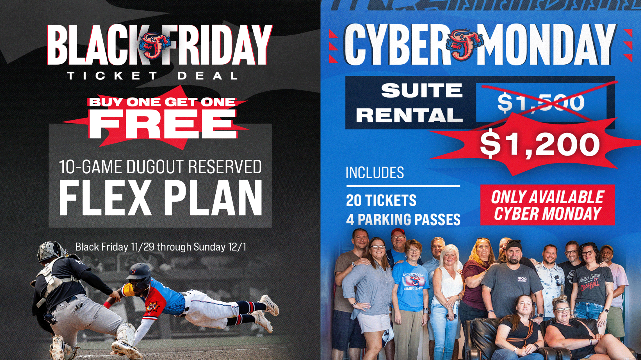 PURCHASE BLACK FRIDAY BOGO DUGOUT FLEX PLAN (SALE RUNS NOV. 29-DEC. 2) PURCHASE CYBER MONDAY SUITE (AVAILABLE DEC. 2 ONLY) JACKSONVILLE, Fla. – The Jacksonville Jumbo Shrimp are excited to roll out their second annual Black Friday and Cyber Monday deals to help provide unforgettable gifts and memories for the