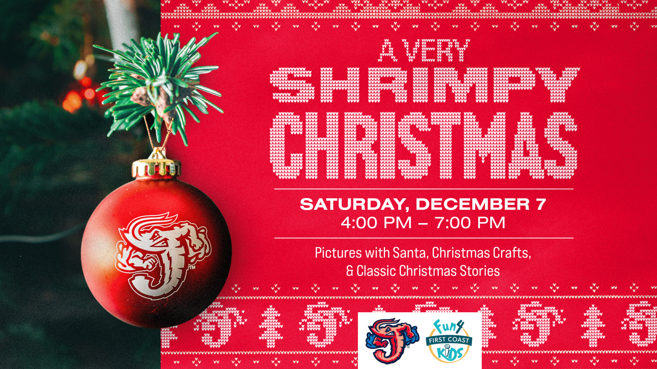 JACKSONVILLE, Fla. – The Jacksonville Jumbo Shrimp and Fun 4 First Coast Kids are inviting families to kick off the holiday season with the seventh annual Very Shrimpy Christmas from 4 p.m.-7 p.m. on Saturday, December 7 at 121 Financial Ballpark. Admission is only $1 per person at the home plate gate, with free parking available in Lot P.