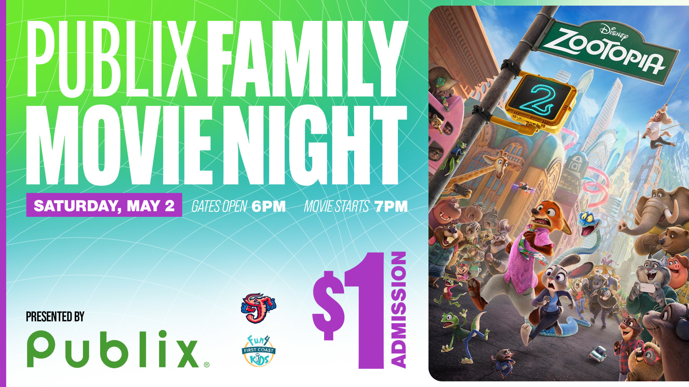 JACKSONVILLE, Fla. – The Jacksonville Jumbo Shrimp’s next Publix Family Movie Night with Fun 4 First Coast Kids is scheduled for 7 p.m. on Saturday, May 2 at VyStar Ballpark. The club will show a screening of “Zootopia 2” on the high-definition video board, with admission set for just $1