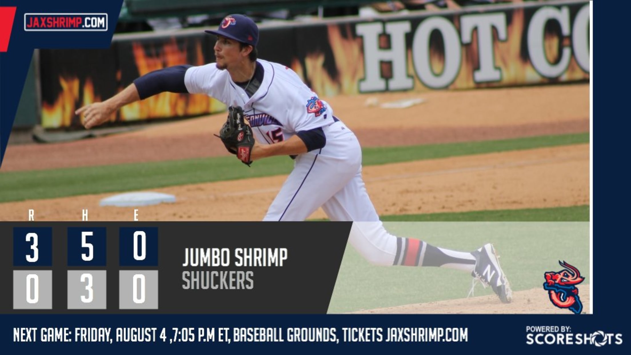 BILOXI, Miss. - The Jacksonville Jumbo Shrimp (19-21, 49-61) defeated the Biloxi Shuckers (18-22, 54-55) by a 3-0 score in the fifth and final game of the five-game series at MGM Park on Thursday night.