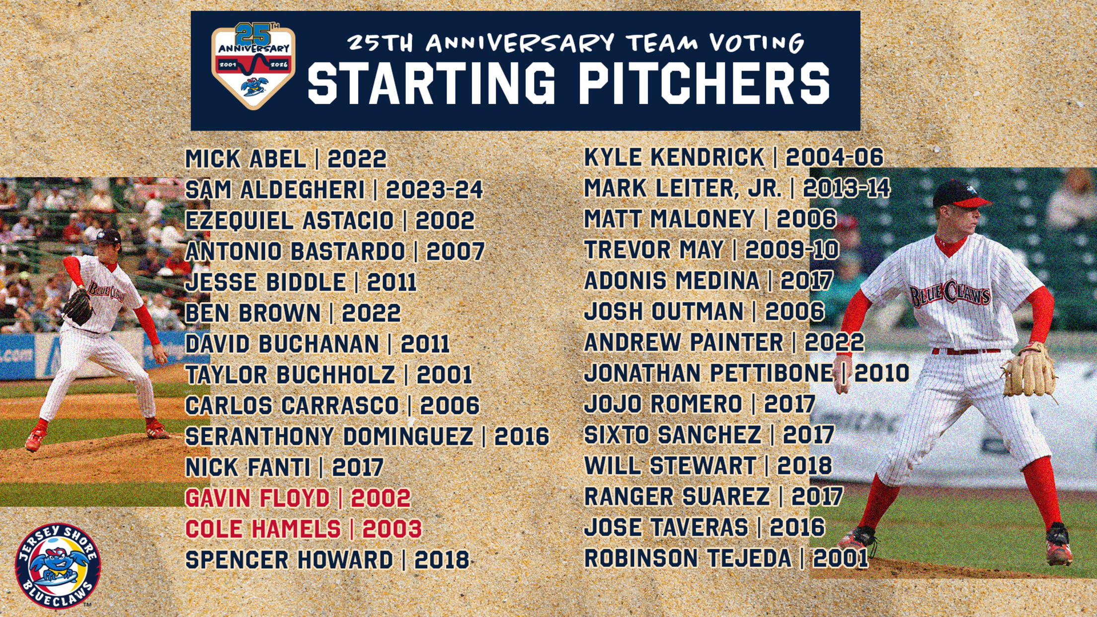 JERSEY SHORE, NJ - Voting is now open for the BlueClaws 25th Anniversary Team. Every Monday, BlueClaws fans can vote on one position group. Position players have been voted on, and this week, we have starting pitchers! In March, the BlueClaws will then unveil the 25th Anniversary Team as part