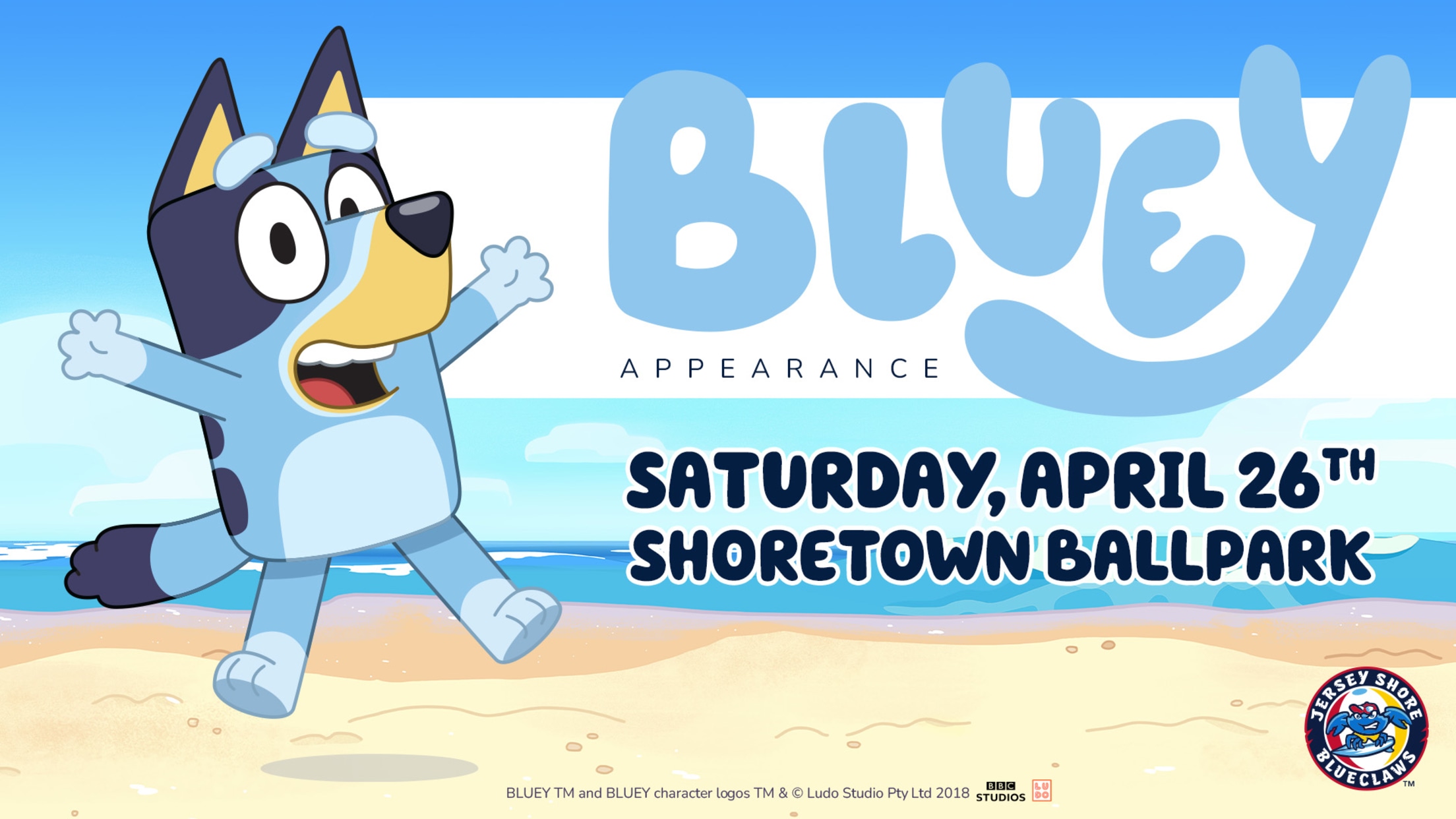 JERSEY SHORE, NJ - On the morning of this morning, the BlueClaws announced that the one and only Bluey will be making a visit to ShoreTown Ballpark this year on Saturday, April 26th at the team's 4:05 pm game against Brooklyn (Mets).