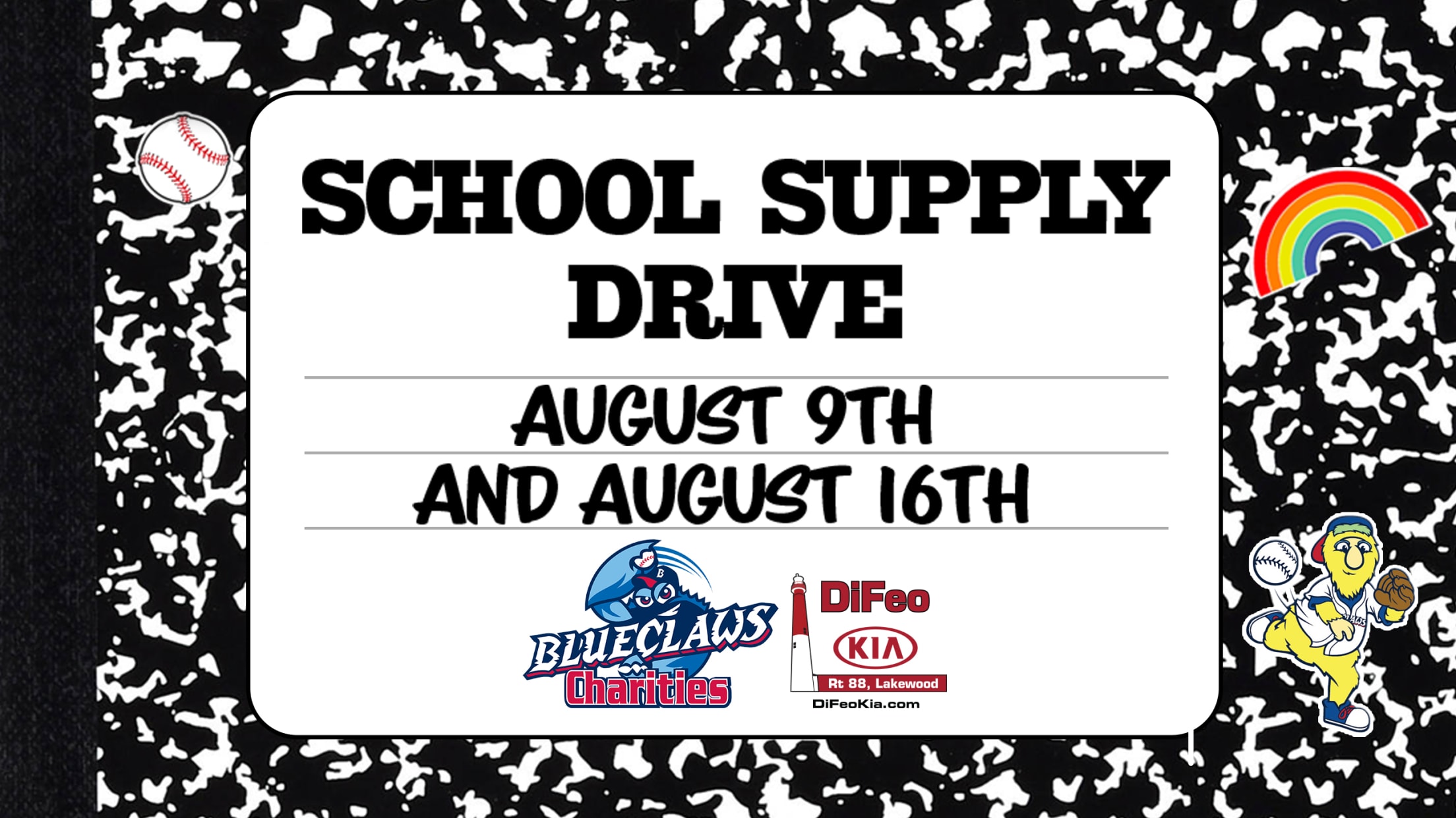 LAKEWOOD, NJ - BlueClaws Charities will be hosting a School Supply Drive, presented by DiFeo Kia, at BlueClaws games on August 9th and 16th. All donors will receive complimentary BlueClaws tickets to the games on August 28th or 29th, the final two home games of the season.