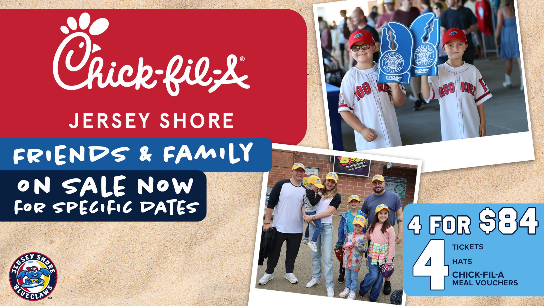 JERSEY SHORE, NJ - Chick-fil-A Jersey Shore Friends & Family tickets for select games, including Opening Night (April 7th) are now on sale! Ticket packages include four tickets, four Chick-fil-A meal vouchers, and four BlueClaws caps!