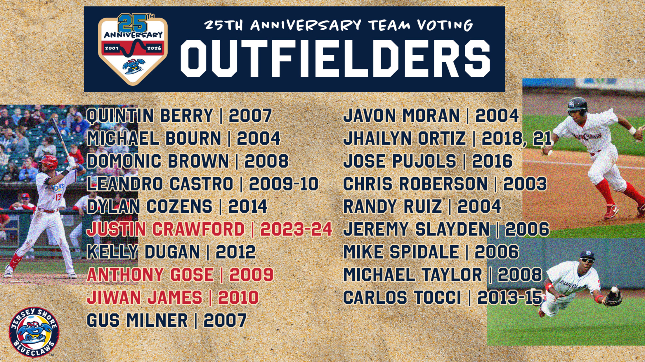 JERSEY SHORE, NJ - Voting is now open for the BlueClaws 25th Anniversary Team. Every Monday, BlueClaws fans can vote on one position group. Catchers and infielders have been voted on, and this week, we have outfielders! In March, the BlueClaws will then unveil the 25th Anniversary Team as part
