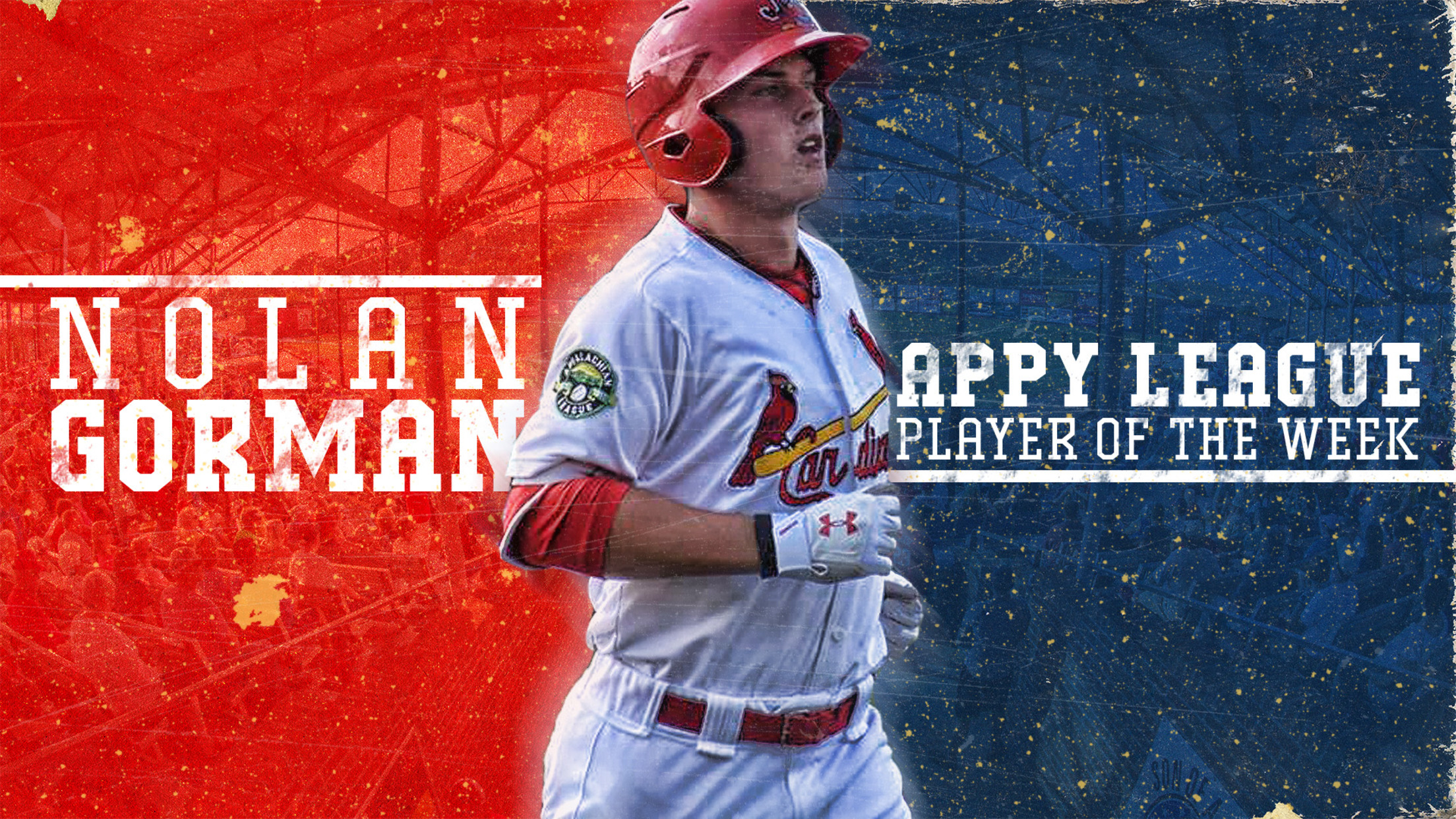 Gorman, the first-round pick of the St. Louis Cardinals in the 2018 First-Year Player Draft, batted .522, going 12-for-23 in five games with three doubles, three home runs, eight RBI, and seven runs scored. He recorded a hit in each Cardinals' game from July 30 through August 5 as part of a nine-game hitting streak. Gorman, 18, currently boasts a .343 average, tied for the fifth-best mark in the Appalachian League.