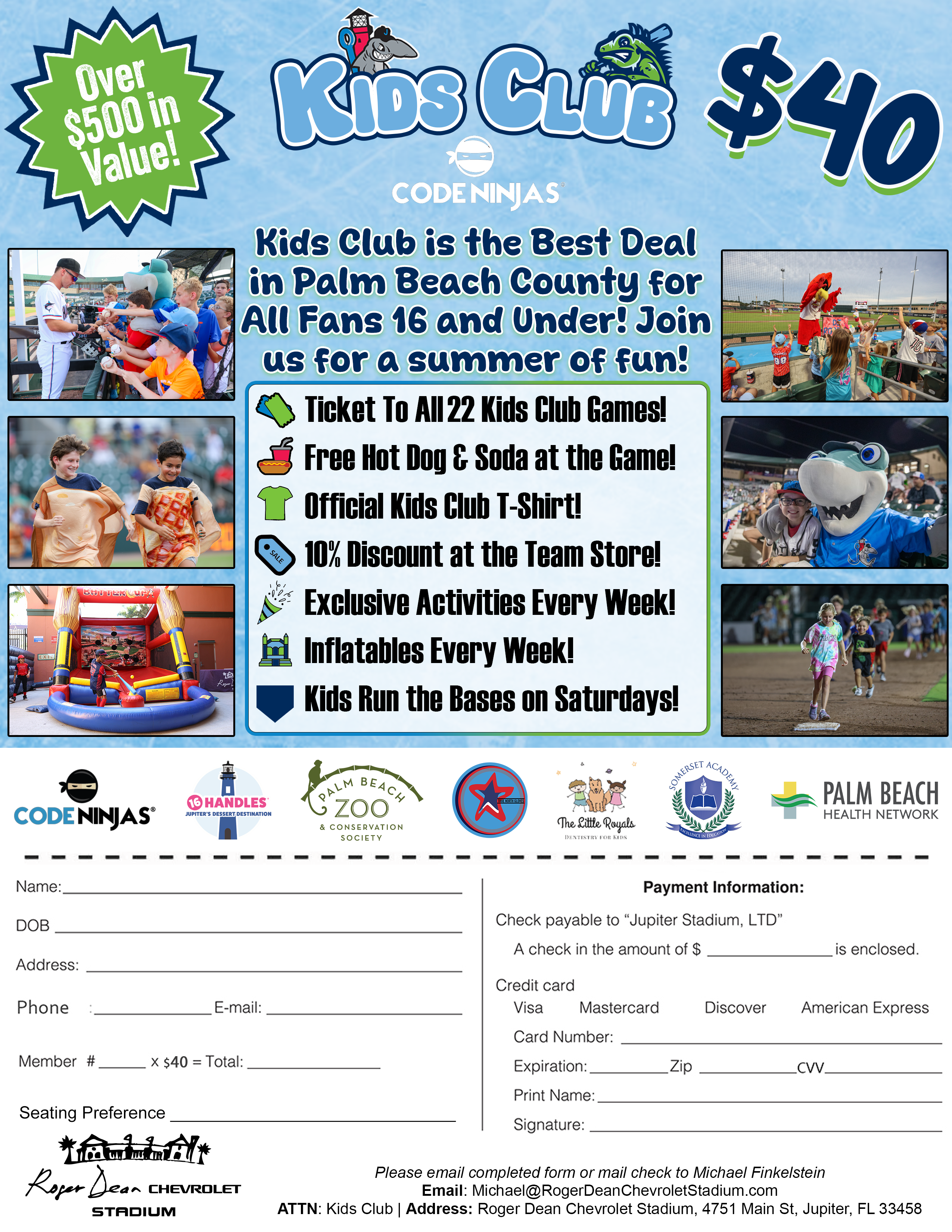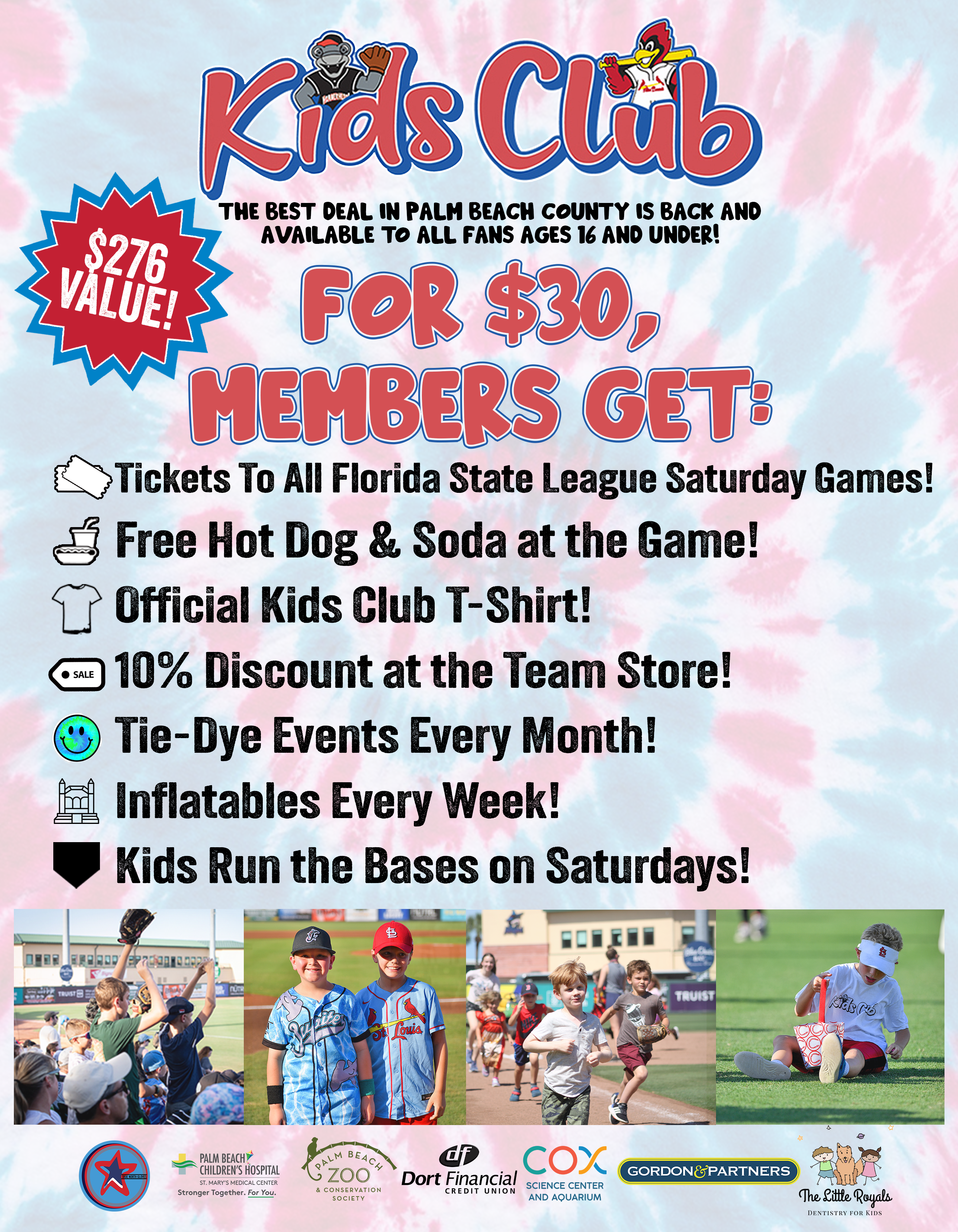 The best deal in Palm Beach county is back for fans ages 16 and under! A Kids Club membership includes admission to all regular season Saturday games, a free hot dog and soda, a membership card, an official t-shirt, a 10% discount at the team store with your membership card! Plus, all kids get a chance to run the bases post game - all for just $40!
