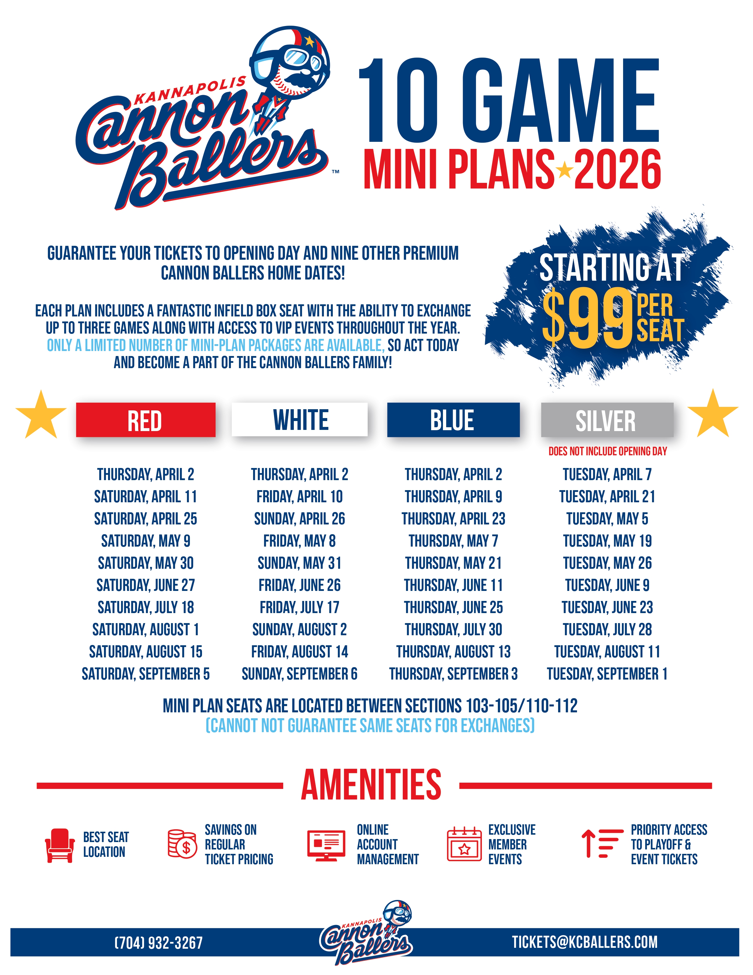 Guarantee your tickets to Opening Night and nine other premium Cannon Ballers home games! Each 10-Game Mini Plan includes a fantastic infield box seat for every game of the package and access to VIP events throughout the season. Only a limited number of Mini Plan packages are available, so act today and become a part of the Cannon Ballers family!