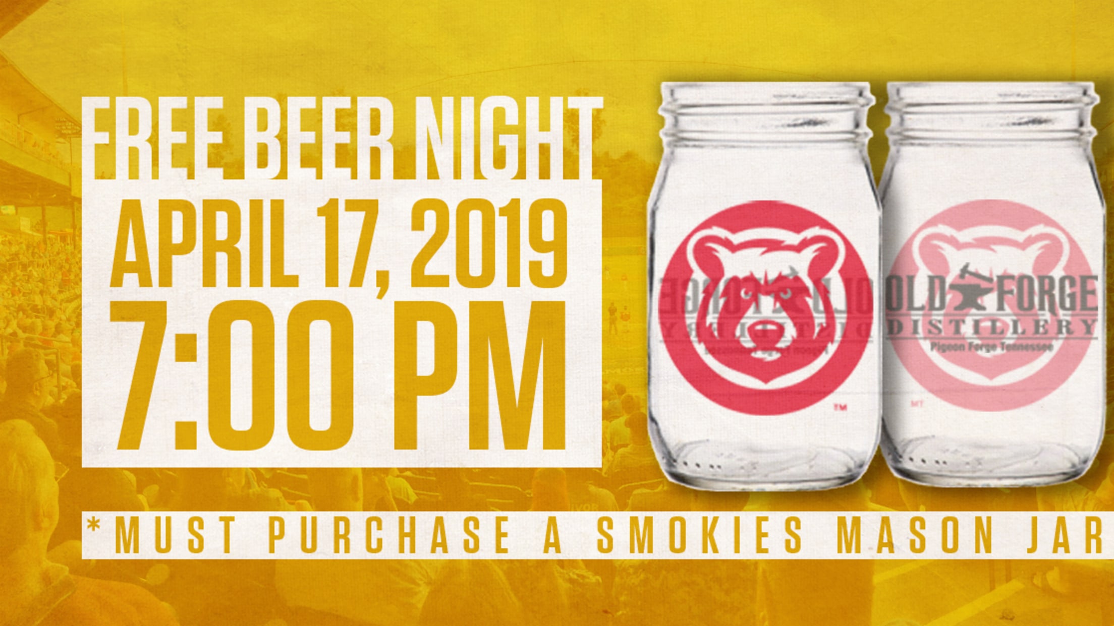 SEVIERVILLE - The Smokies have announced that the team will be hosting a Free Beer Night presented by Bud Light on Wednesday, April 17, 2019 and a Pre-Easter Celebration on Saturday, April 20, 2019.  With the purchase of a ticket and a 2019 refillable Smokies mason jar, fans will be able to