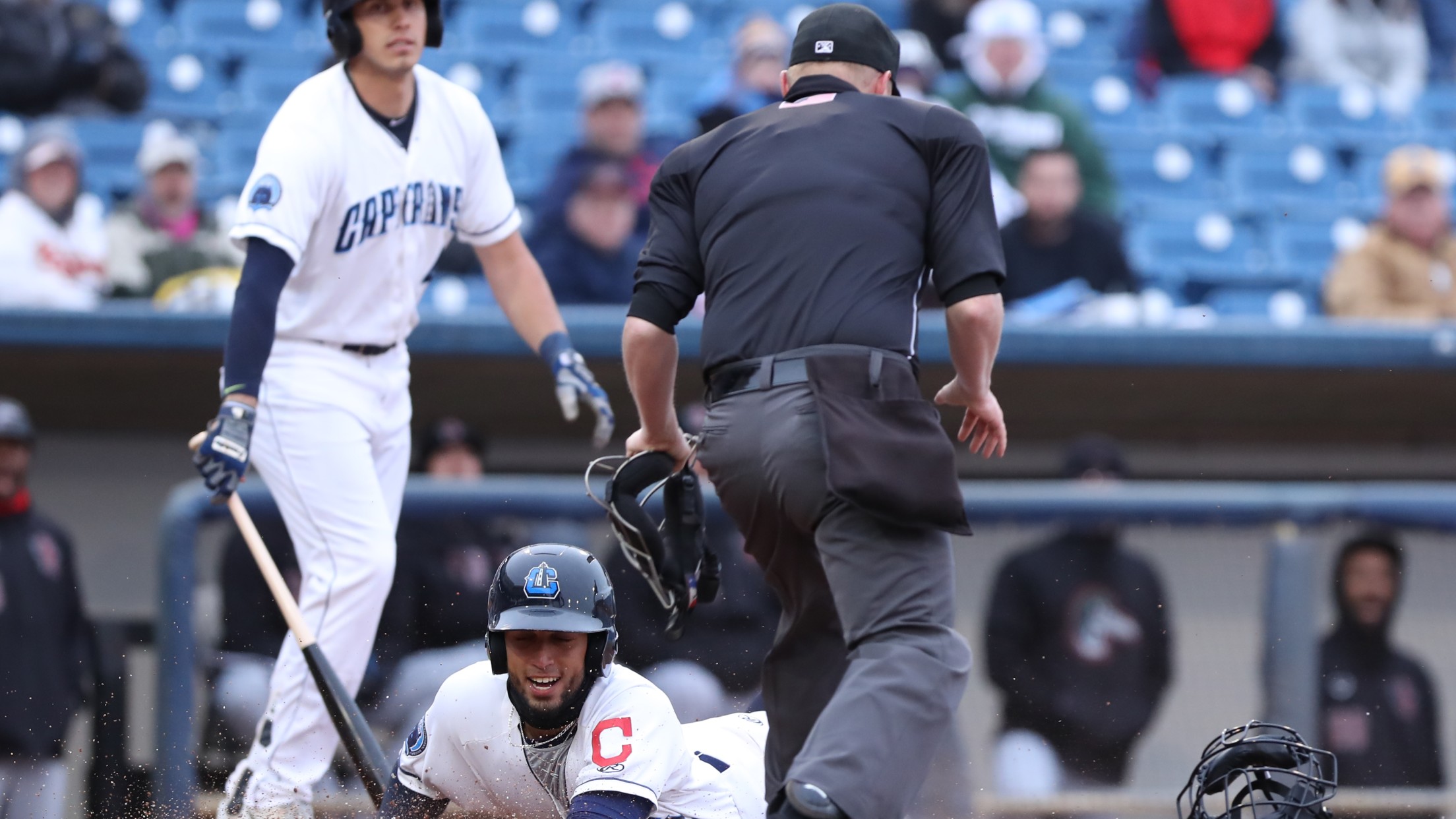 Jose Fermin slides in safely at home as part of a first-inning double steal that plated the Captains' first run of the season. (Tim Phillis - TCP Photography)