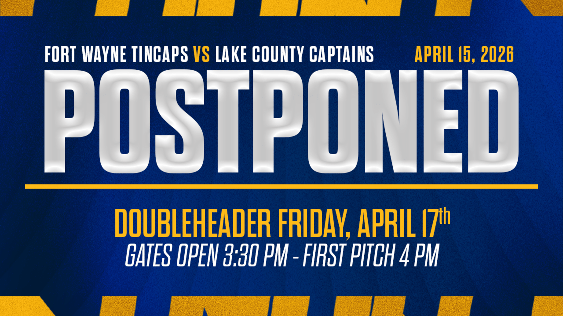 EASTLAKE, Ohio – The second game of a scheduled six-game series between the Lake County Captains (5-5) and the Fort Wayne TinCaps (3-7) set for tonight, Wednesday, April 15, has been postponed due to anticipated inclement weather. The two teams will make up this contest as part of a seven-inning