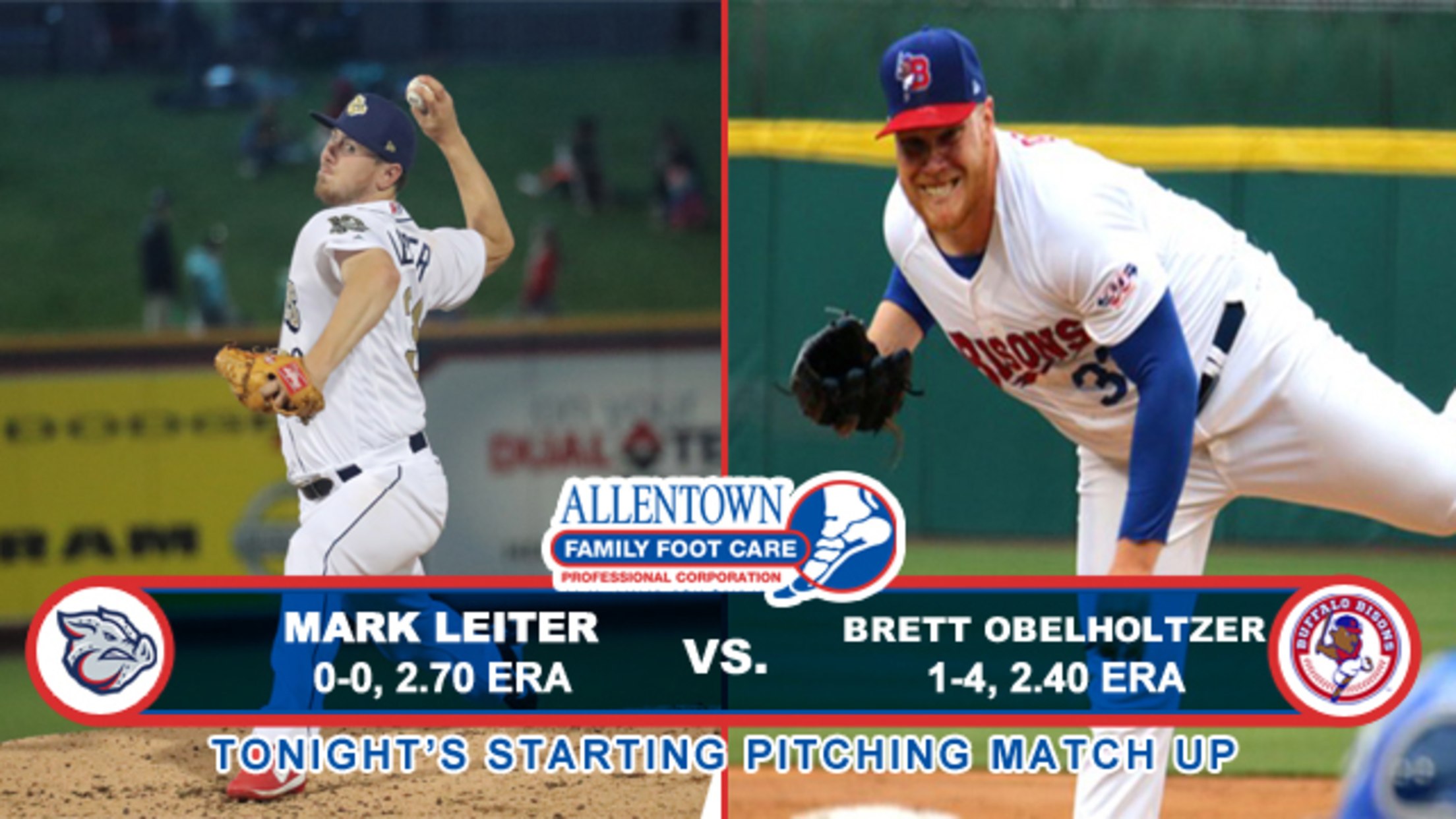 The Pigs will send RHP Mark Leiter Jr. (0-0, 2.70) against Bisons LHP Brett Oberholtzer (1-4, 2.40).Today's starting pitching matchup is presented by Allentown Family Foot Care, which provides the latest in medical and surgical treatments of the entire foot and ankle. Learn more at affc.com.