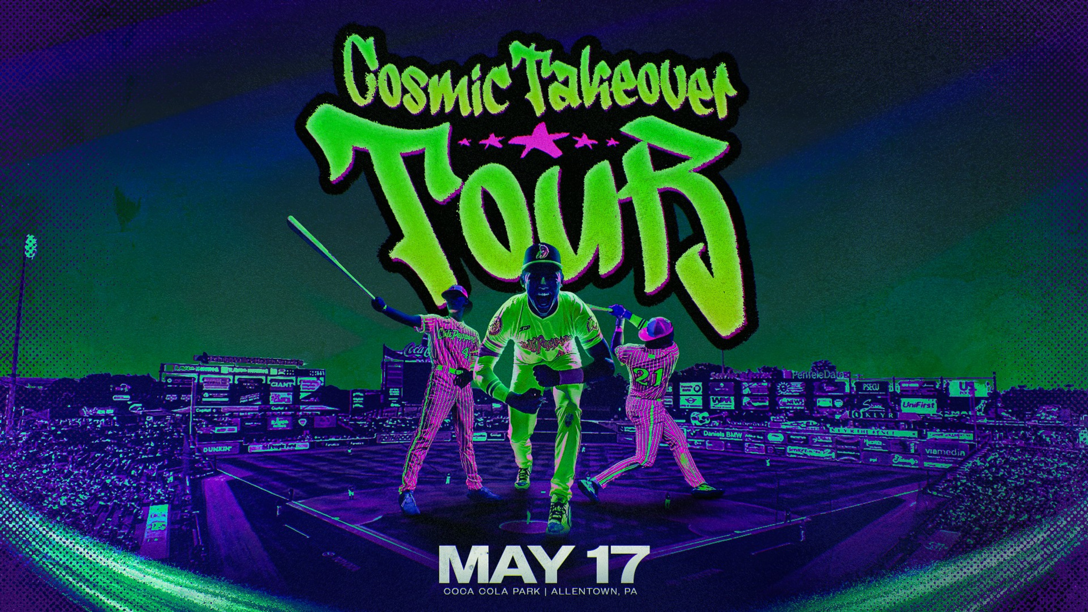 The IronPigs will host the Cosmic Takeover Tour during the 2025 season on May 17th at Coca-Cola Park. To make sports history, the Cosmic Takeover Tour uses the world’s only stadium grade black lights. The IronPigs will be one of the stops on the inaugural Cosmic Takeover Tour that will be traveling to multiple cities across the U.S. in 2025. The organization blends traditional baseball with over the top fan engagement with a combination of top level players, music and mind-bending special effects.