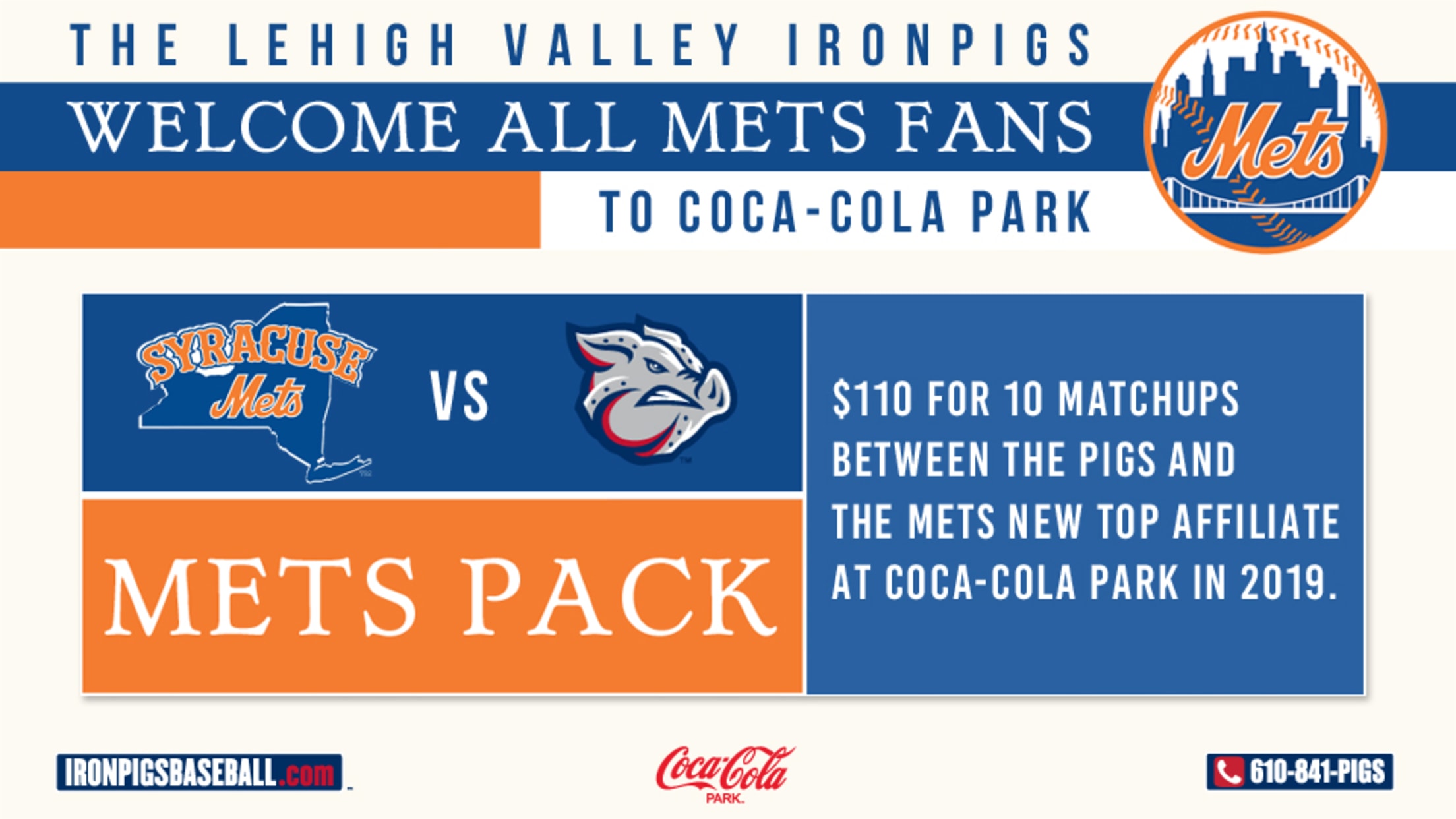 Starting in 2019, the Mets' Triple-A operations will shift from Las Vegas in the PCL to Syracuse and the Syracuse Chiefs will now be known as the Syracuse Mets. To celebrate, the IronPigs are pleased to offer special plans that give fans a seat for 10 contests between the IronPigs and Mets next season at Coca-Cola Park.