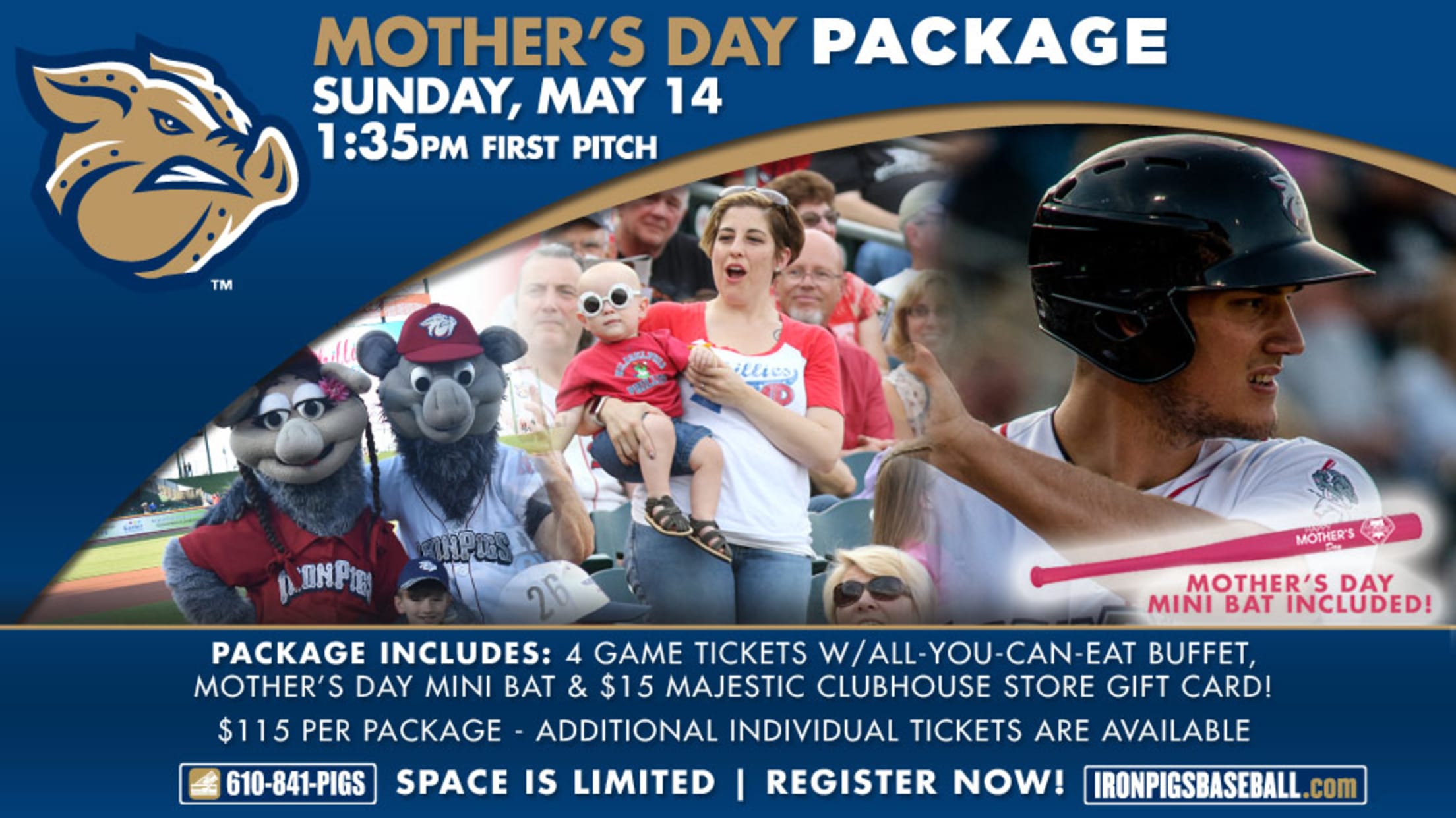 In addition to the game tickets and buffet, you'll receive a commemorative pink Mother's Day Mini Bat along with a $15 gift card to the Majestic Clubhouse Store at Coca-Cola Park! Additional individual tickets are also available for this package for $28.75 each. To add on any additional tickets, you must call (610) 841-PIGS (7447).