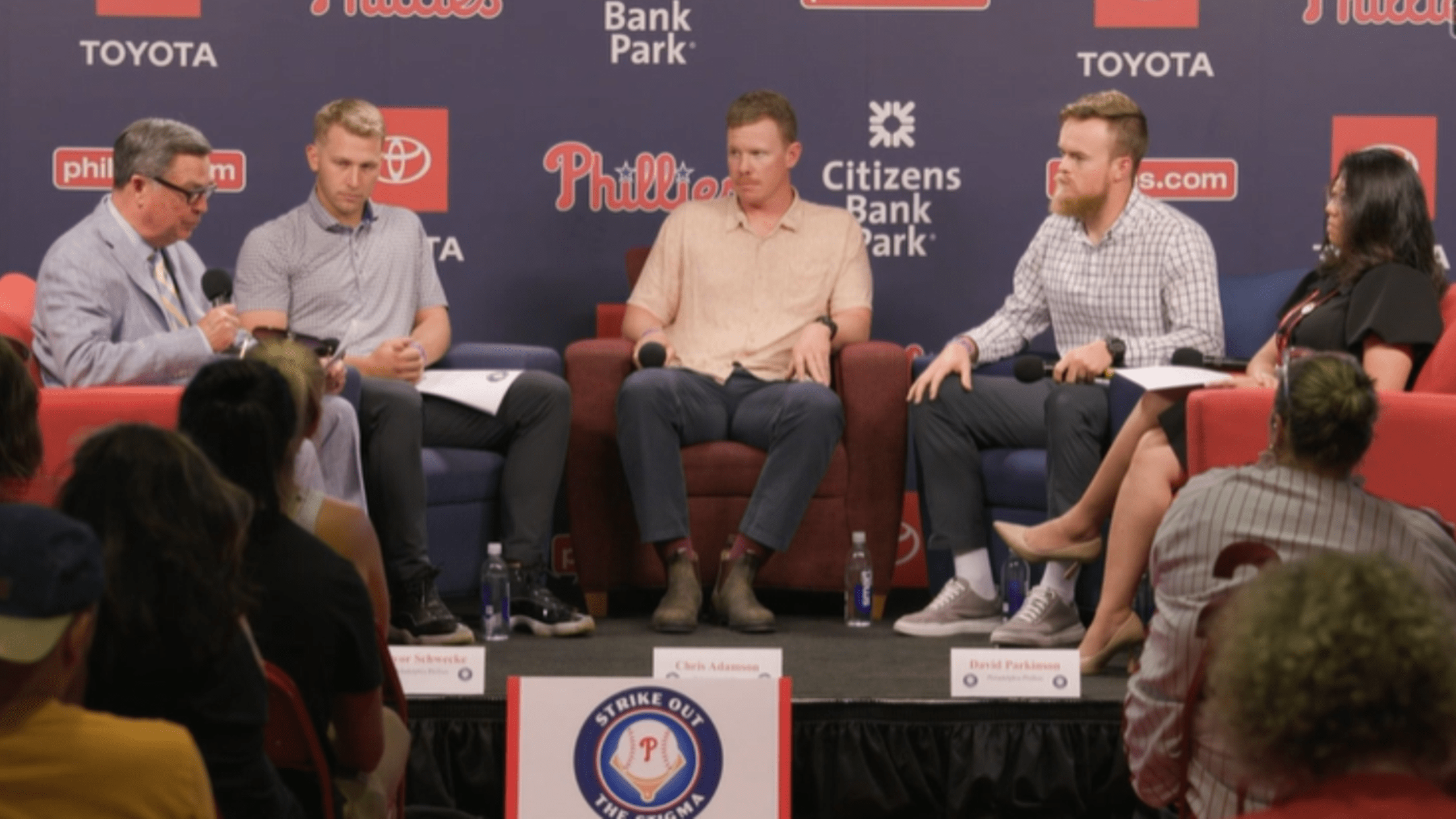 Monday, June 17 was an off-day for the Lehigh Valley IronPigs. But for two IronPigs, Bench Coach Chris Adamson and pitcher David Parkinson, they had to make a work appearance. The trio was invited to Citizens Bank Park to participate in the Phillies initiative of “Strikeout the Stigma” which is a Phillies Community Outreach initiative focused on bringing important conversations to the forefront about the value of healthy life habits, supporting those around us, and removing the negative connotation surrounding mental health. Adamson, Parkinson, and Schwecke were selected to form a panel for a conversation centering around mental health awareness within professional sports, specifically baseball.