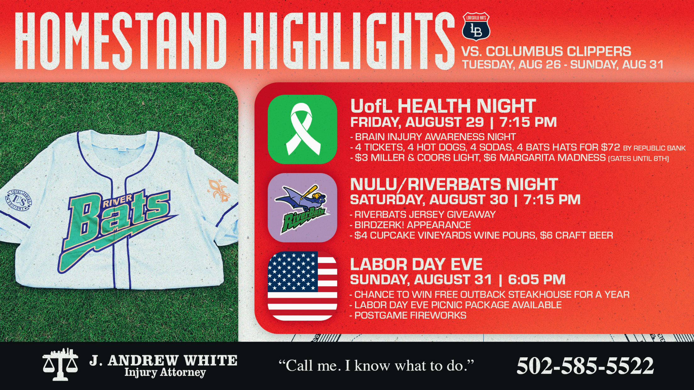 - RiverBats Replica Jersey Giveaway: The first 1,500 fans through the gates will receive a home white throwback RiverBats replica jersey, presented by Total Cleaning Solutions.