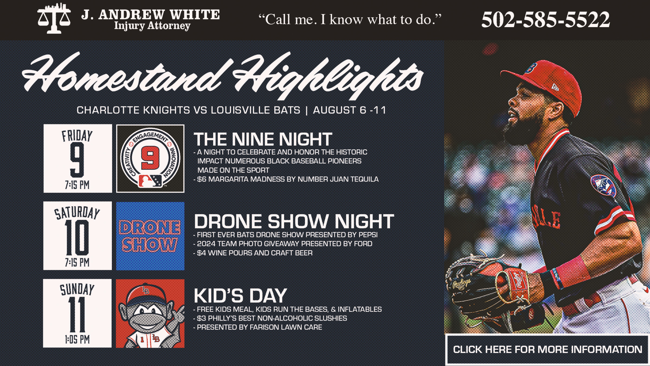 The Louisville Bats return from a lengthy road trip for a six-game set at Louisville Slugger Field. The series will feature the State Farm Bobblehead You! Activation returning on Tuesday and Wednesday, The Nine Night on Friday as the Bats honor the rich tradition of Nego League Baseball and play as the Louisville Black Caps, and the first-ever Drone Show at a live sporting event in Kentucky on Saturday.
