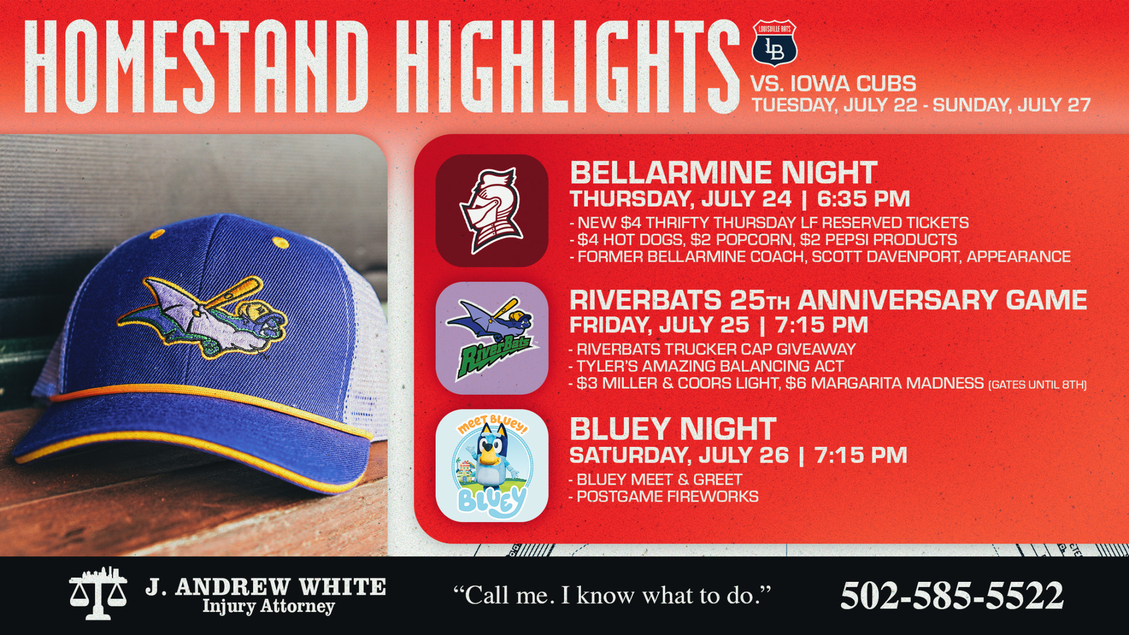 - 25 Years of RiverBats: Tonight, we celebrate the 25th anniversary of the RiverBats! Our throwback RiverBats jerseys will be back in action, plus some special guests from RiverBats history will be at the ballpark! The first 1,500 fans at Slugger Field will take home a RiverBats mesh trucker hat, presented by Total Cleaning Solutions.