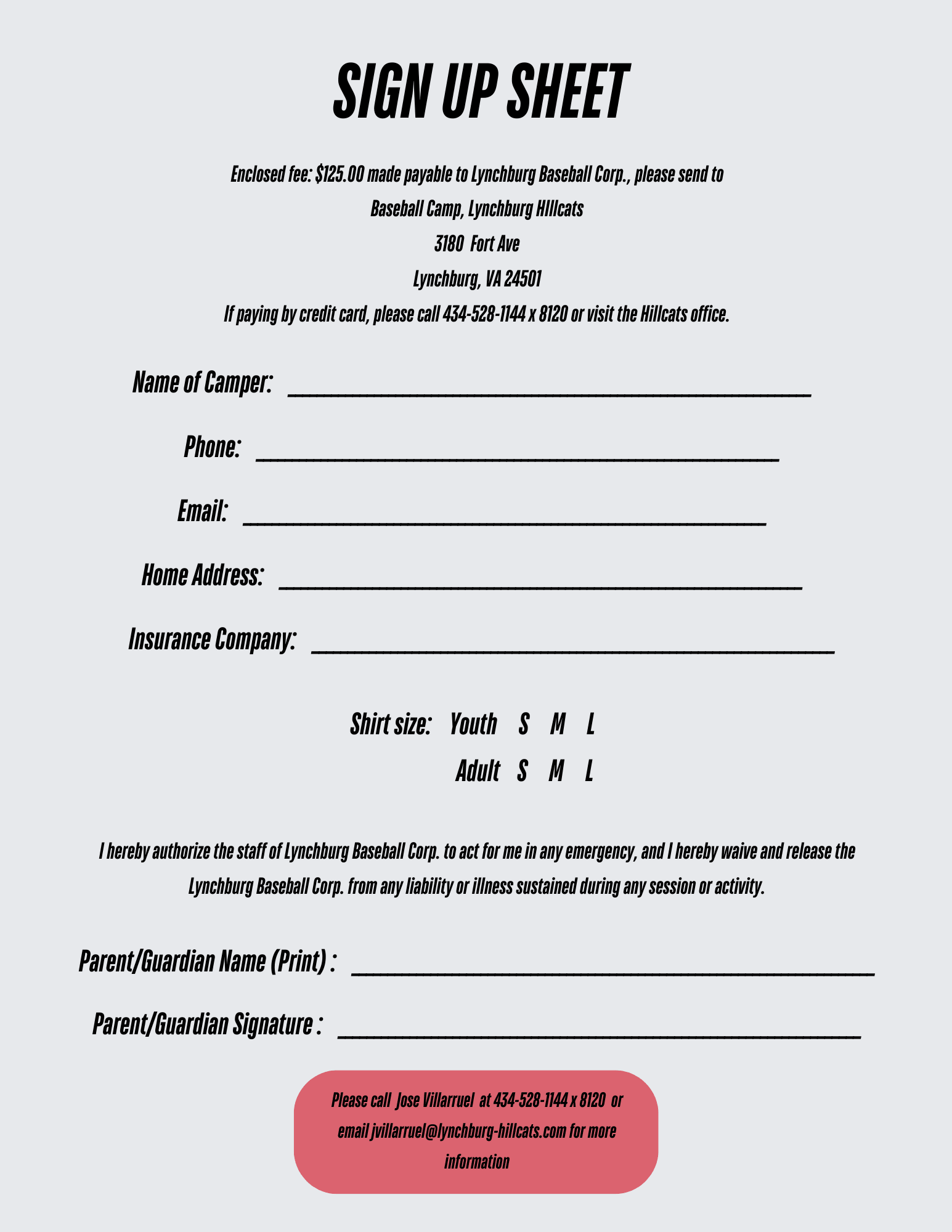 Registration is not guaranteed until payment has been received by the Hillcats. Please download, complete, and email the registration form to Lincoln Evans, at [email protected]. For more information, please call (434) 528-1144.
