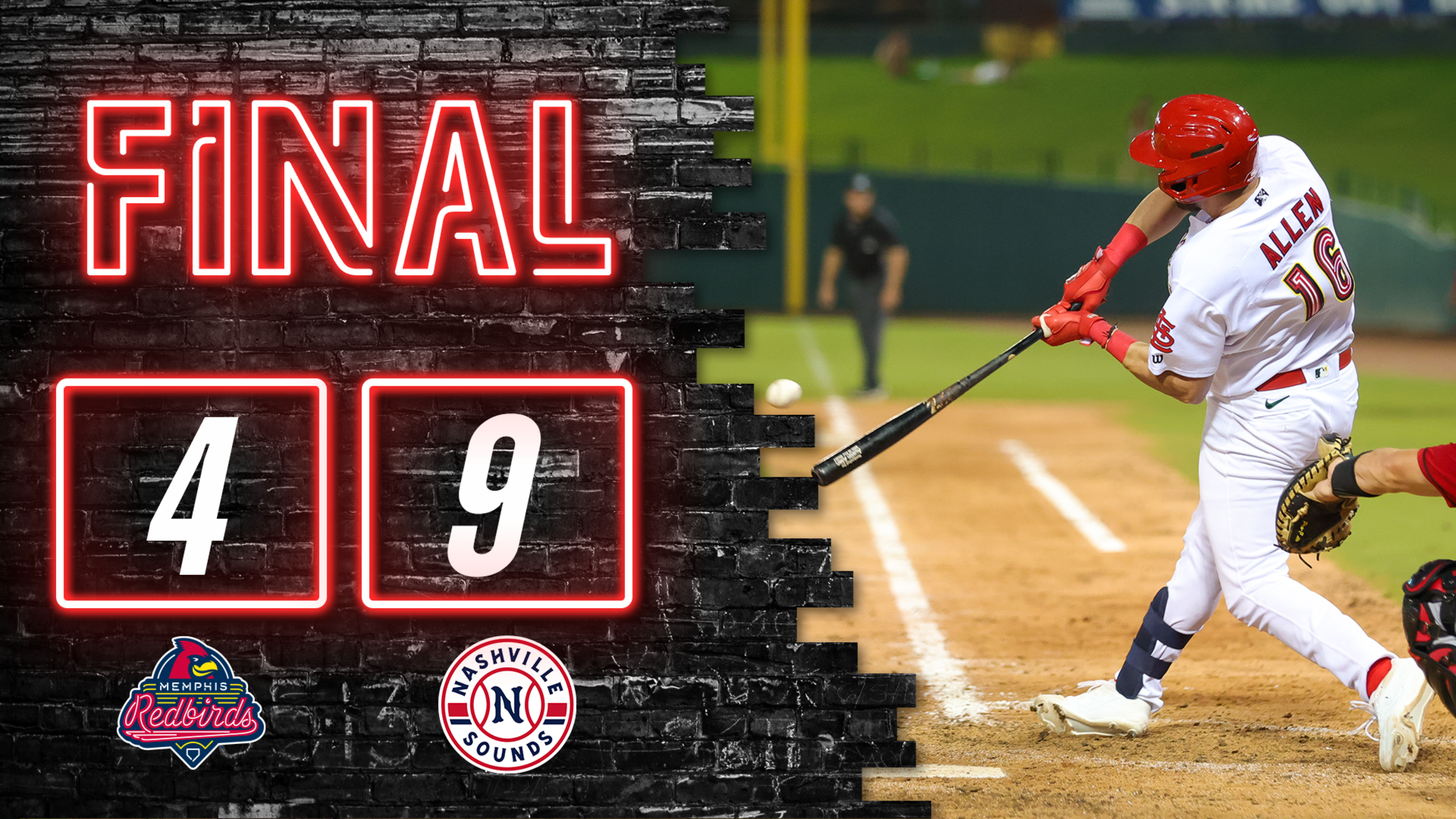 Memphis brought the game within one, but a five-run bottom of the eighth inning cruised the Sounds to a sizable victory. The Redbirds did not go down without a fight, scratching across a run in the ninth but left the bases loaded.