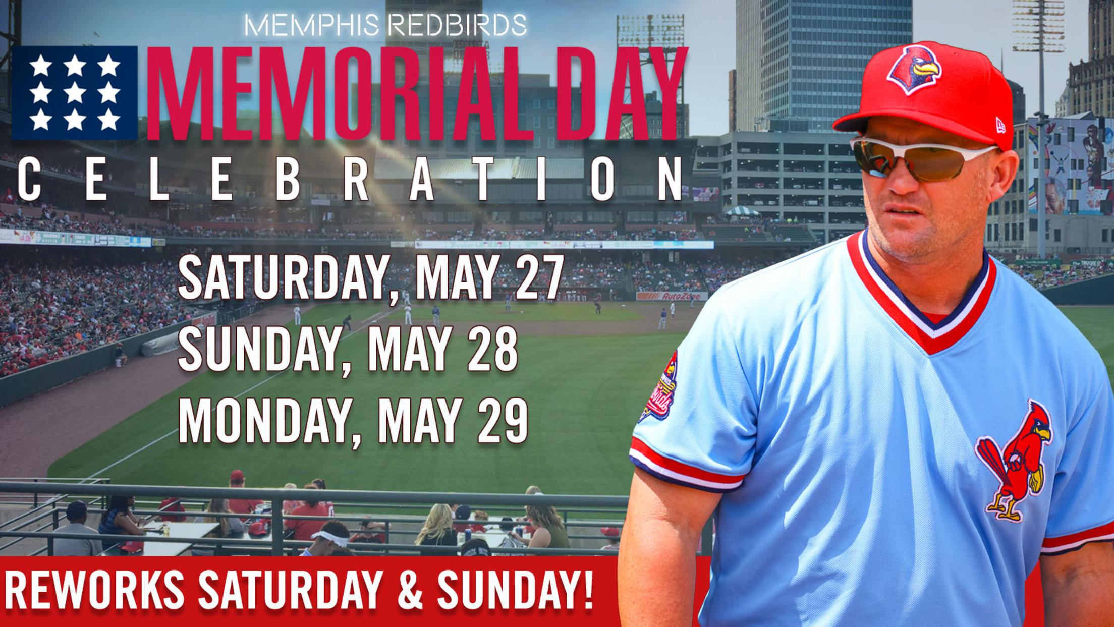 "Leave everything to us this Memorial Day weekend!" Redbirds President/General Manager Craig Unger said. "We'll provide the food, the entertainment, and the fireworks, so all you need to do is gather your friends and family and head down to AutoZone Park for a relaxing and memorable weekend."