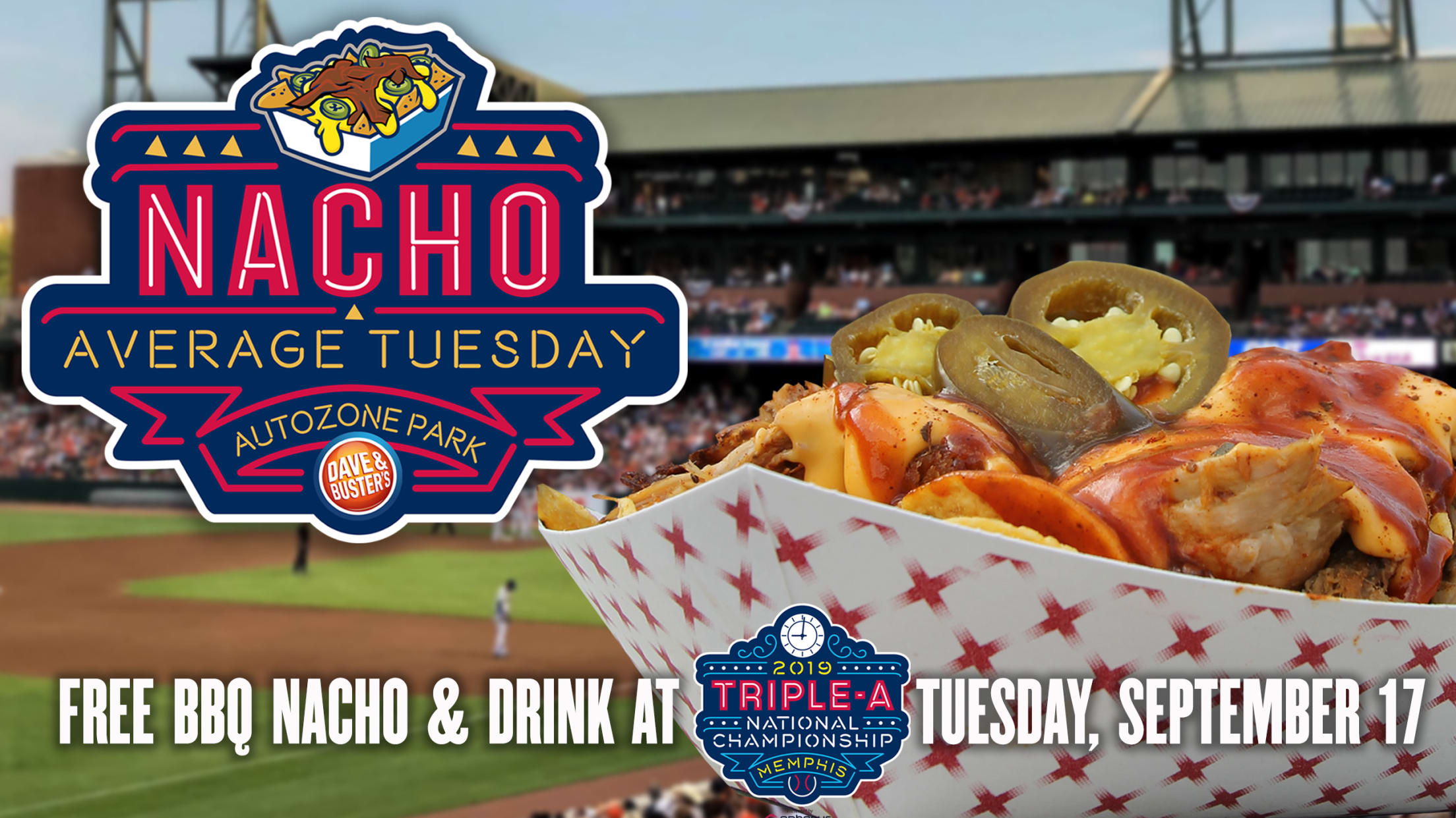 All fans at the Triple-A National Championship Game at AutoZone Park on Tuesday, Sept. 17 will receive a free order of BBQ Nachos and a free soda or bottled water, as part of "Nacho Average Tuesday" presented by Dave & Buster's.