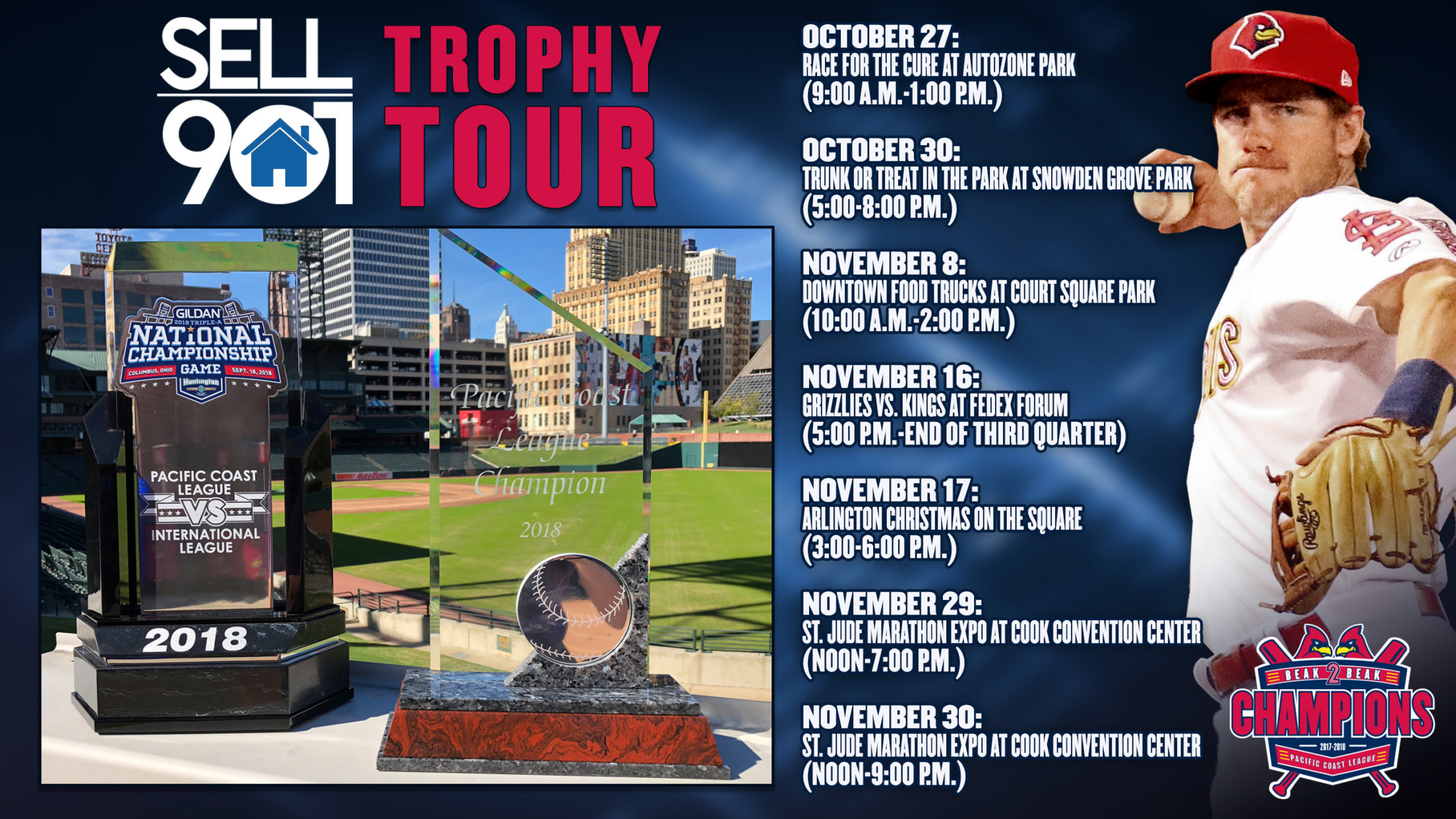 MEMPHIS, Tennessee - The Memphis Redbirds are packing up their brand-new hardware to tour the region on the Sell901 Trophy Tour, where fans can see and take pictures with the 2018 Pacific Coast League and Triple-A National Championship trophies.Each tour spot is also scheduled to feature the chance for fans
