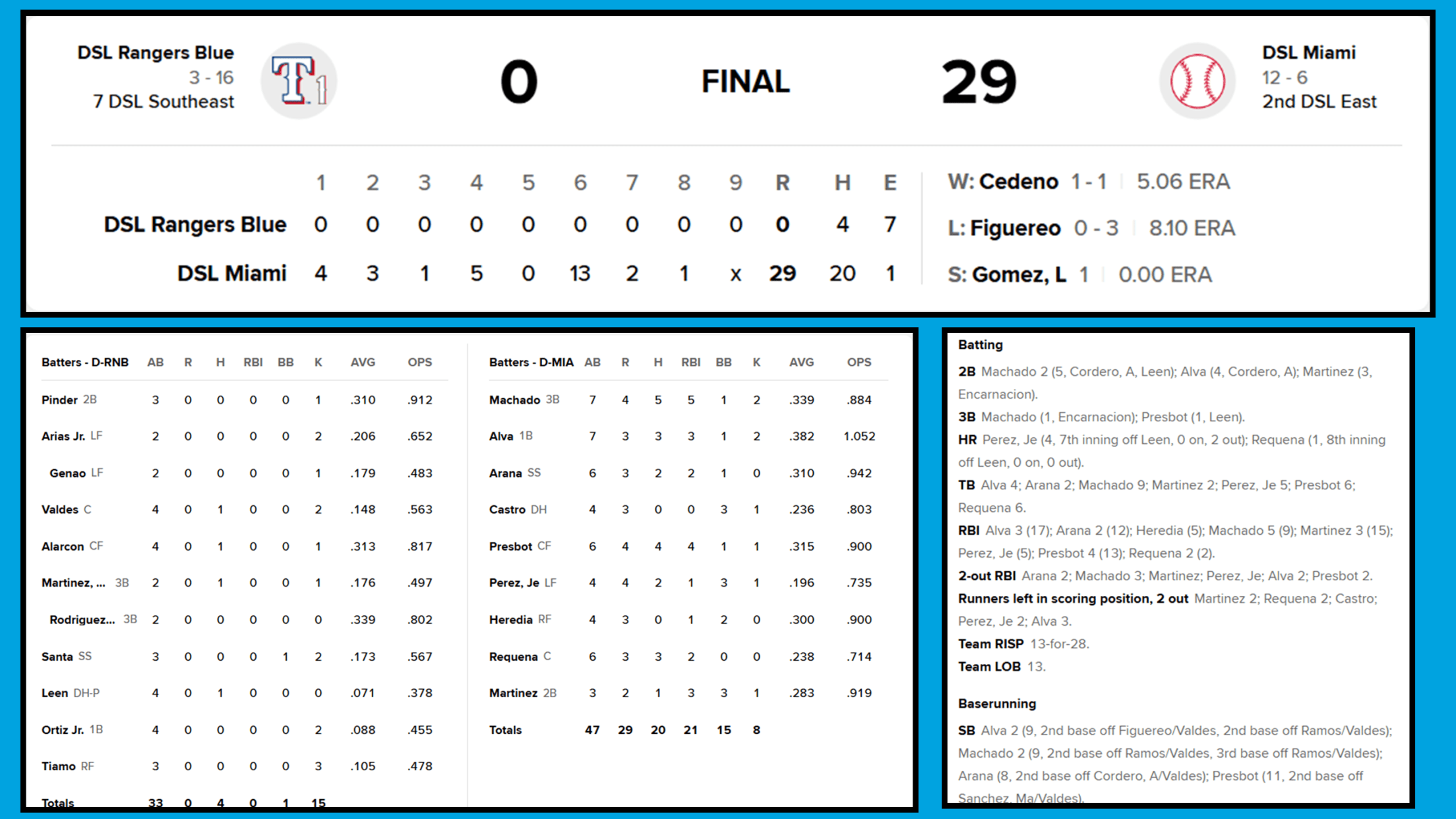 Even before the 13-run inning, it wasn’t close. Friday’s Dominican Summer League game between DSL Rangers Blue and DSL Miami featured quite the lopsided result -- an impressive 29-0 win for one of the Marlins’ Rookie-level affiliates.