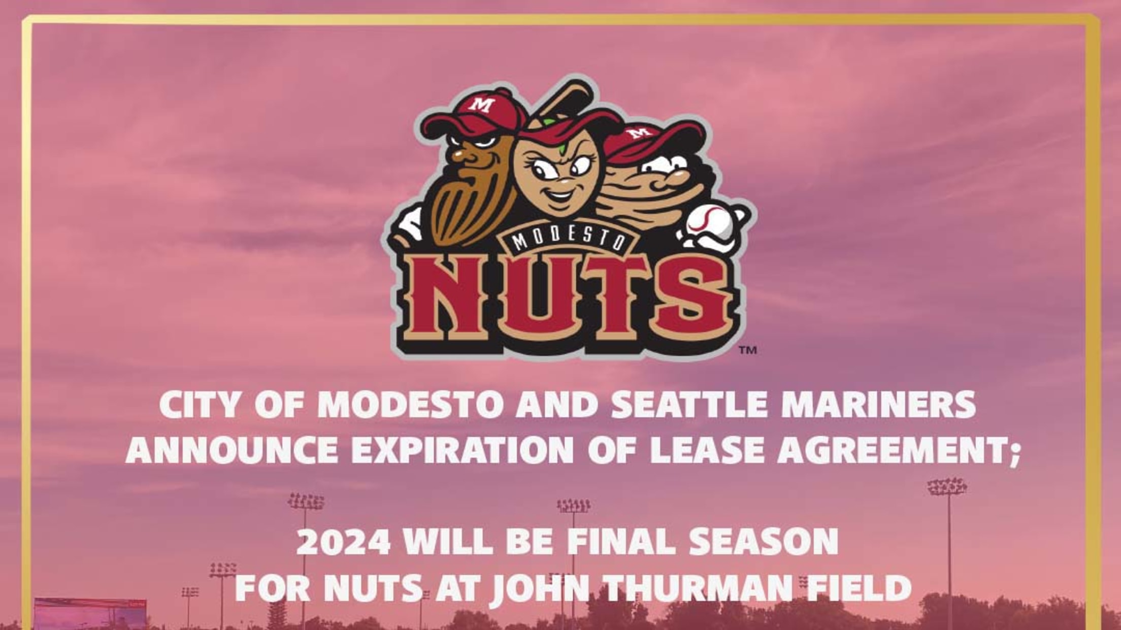 Modesto, CA, July 10, 2024 - The Seattle Mariners and the City of Modesto announced today that a mutual agreement on a long-term lease extension for the California League Modesto Nuts could not be reached. While both entities hoped for a more favorable outcome, the negotiations were unsuccessful, and the current lease agreement will expire on September 30, 2024. Due to the Lease expiration, the 2024 season will be the final season of the Nuts in Modesto at John Thurman Field.