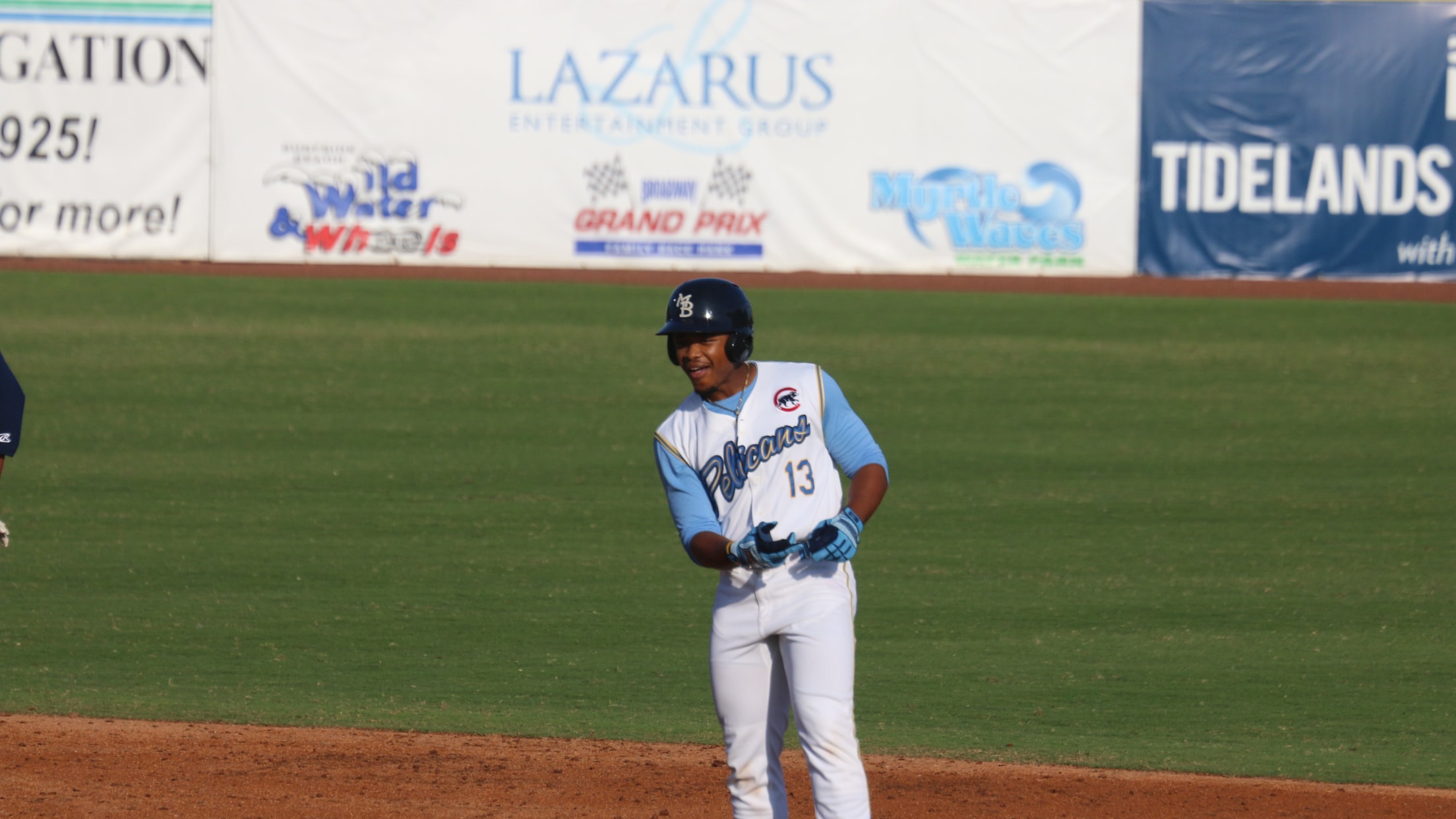 BJ Murray stands on second base after a double.Larry Kave/Myrtle Beach Pelicans