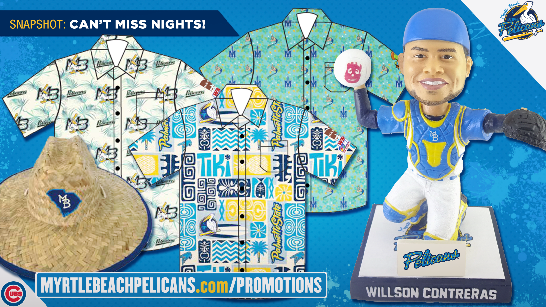Giveaways: Beginning in June fans will have the opportunity to take home multiple premium giveaway items. Giveaways include a Hawaiian Shirt Series featuring a Braves era Pelicans design (June 27), a Mermen design (July 23), and a Pelicans design (August 1). June 20 features a Willson Contreras themed giveaway as a part of Cubs-A-Palooza. The figurine features a bobblearm rather than the standard bobblehead and is designed with Contreras in the catcher’s position preparing to throw a ball. However, instead of a baseball, this unique design has Willson throwing Wilson the Volleyball from the movie Cast Away. The film, for which Tom Hanks took home a Golden Globe Award for Best Actor, is celebrating its 20 year anniversary. September 5 rounds out the giveaway calendar with a Palmetto State Beach Hat giveaway.