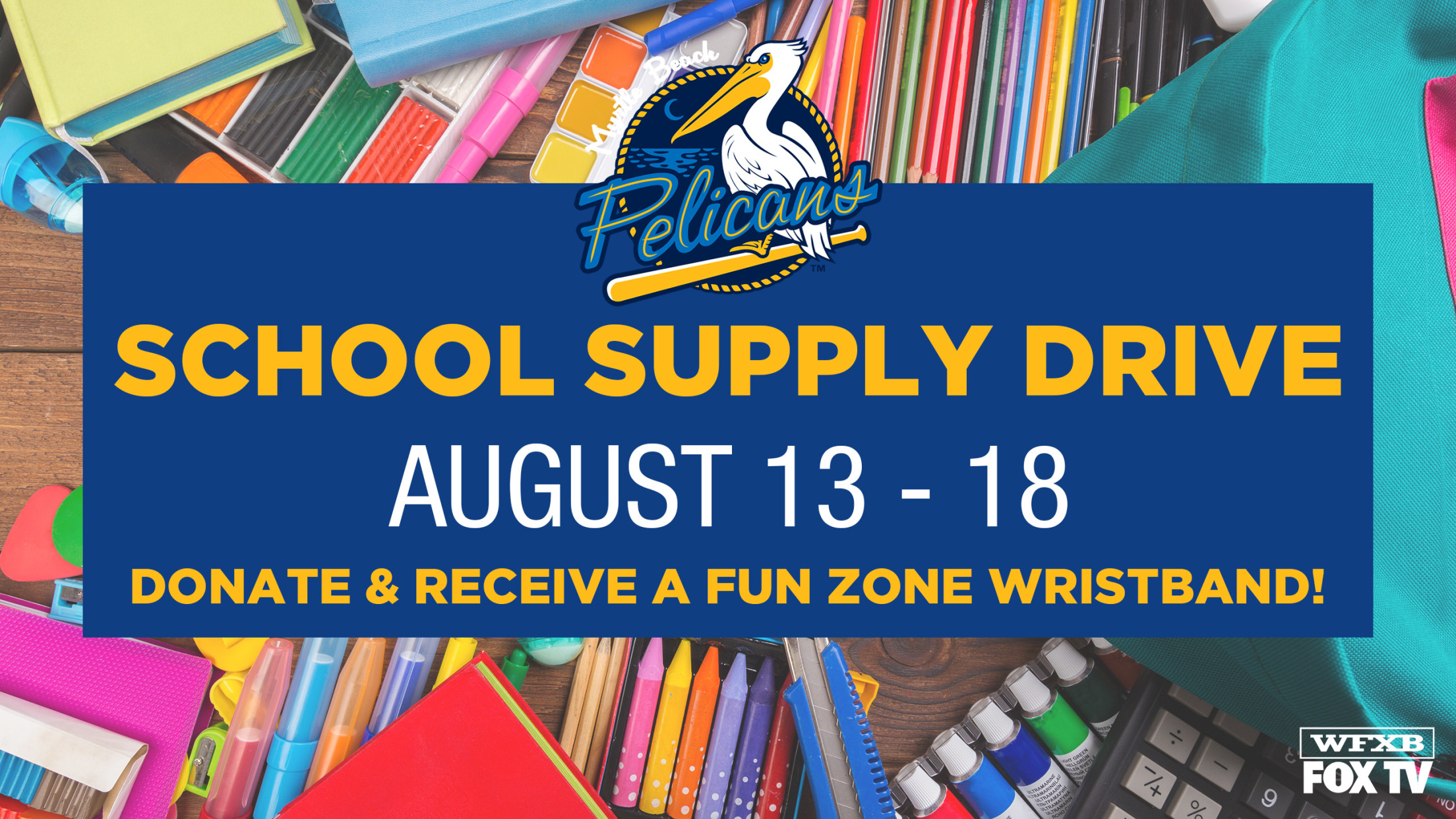 With the new school year just around the corner, the Myrtle Beach Pelicans have teamed up with WFXB News to host a school supply drive at Pelicans Ballpark. The drive will run August 13 through 18. With the donation of any school supplies fans will receive a free wristband to the Sky Zone Fun Zone at Pelicans Ballpark. The wristband is valued at $5 and is available to kids 12 and under.
