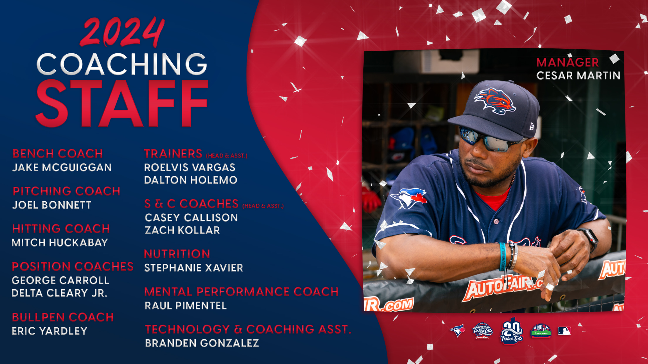Cesar Martin returns to manage the team for a fourth consecutive season. “We look forward to a successful 2024 both on and off the field as we celebrate our 20th anniversary season, and we have excellent on-field leadership with Cesar and this talented coaching staff,” Fisher Cats General Manager Michael Neis said. “Cesar does a tremendous job embracing our community and the fans who come to Delta Dental Stadium.”
