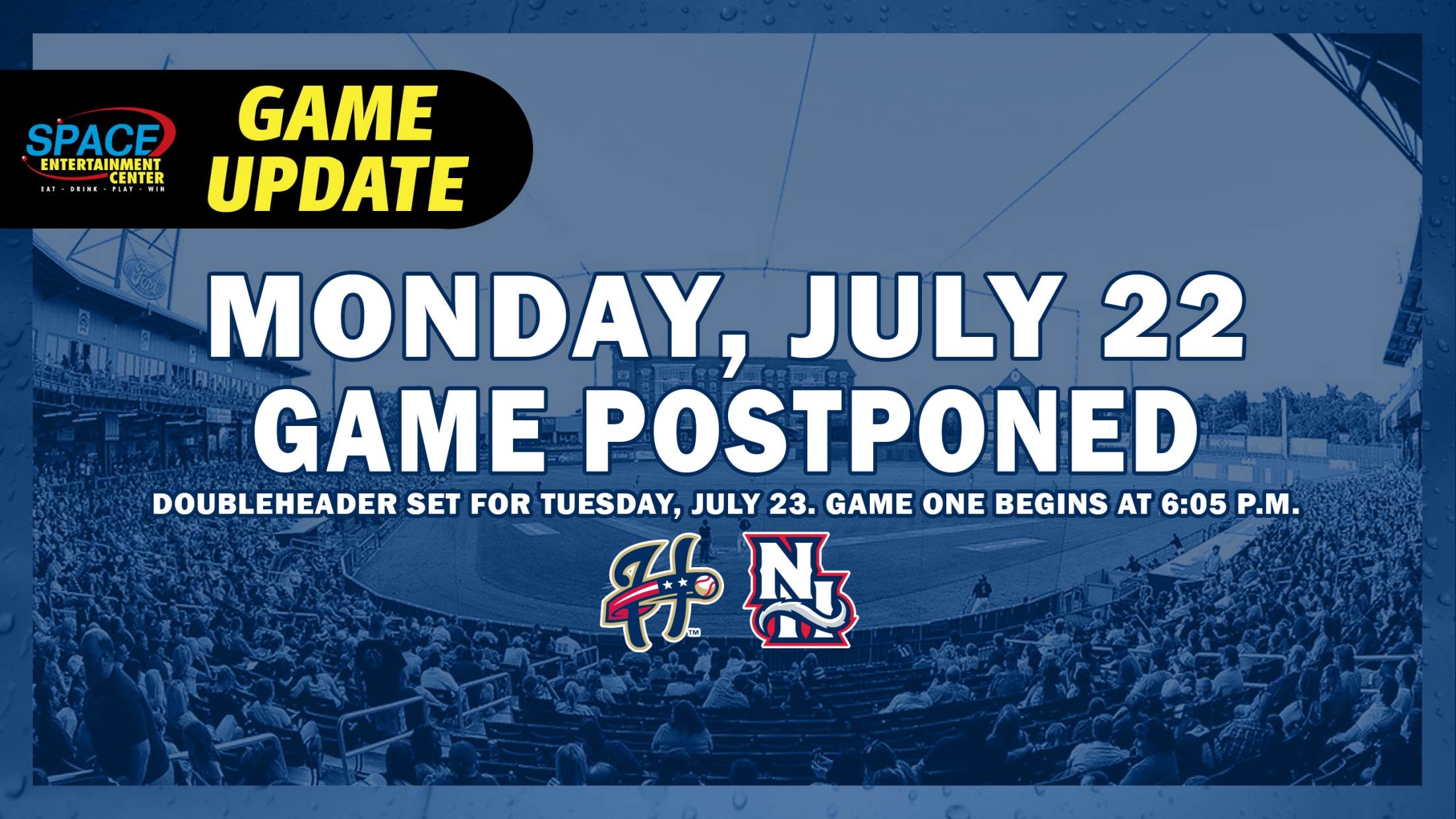 Manchester, NH - Monday night's game between the New Hampshire Fisher Cats (Blue Jays Double-A affiliate) and Harrisburg Senators (Nationals Double-A affiliate) has been postponed due to rain.The game will be made up as part of a doubleheader on Tuesday night at Delta Dental Stadium. The teams will play two seven-inning