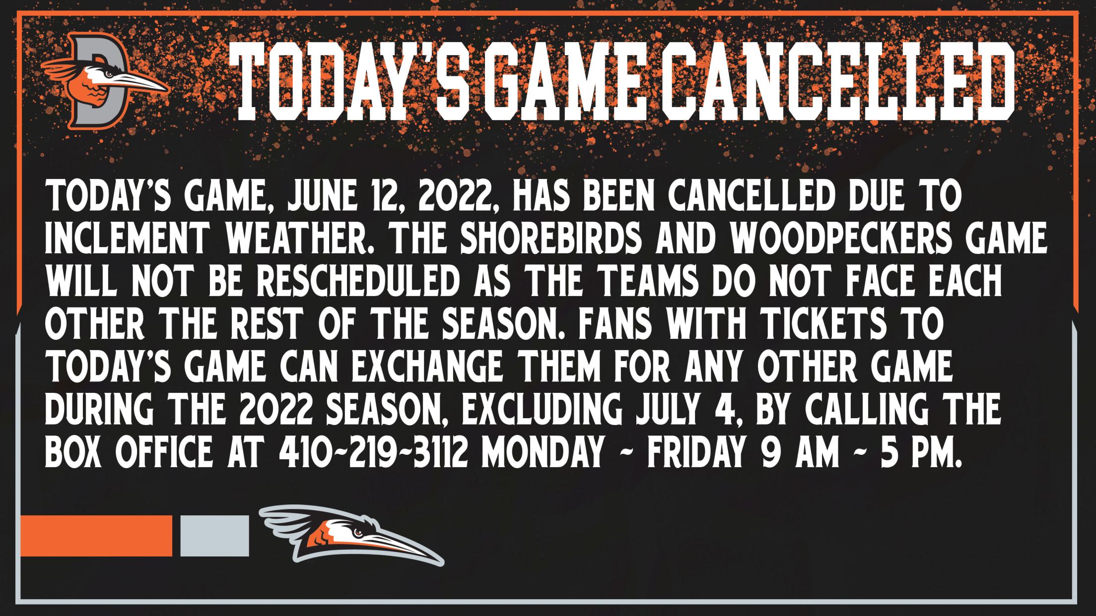 Salisbury, MD -- Due to inclement weather, the Delmarva Shorebirds and Fayetteville Woodpeckers game scheduled for Sunday, June 12 is cancelled. The game will not be rescheduled as the Shorebirds and Woodpeckers do not play each other again this season. Fans with tickets to today’s game can exchange their tickets