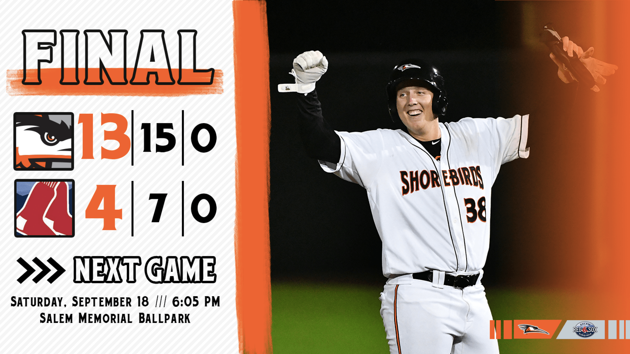 SALEM, VA - The Delmarva Shorebirds saw an early 2-0 lead slip away before busting open for a seven-run fifth inning to claim an emphatic 13-4 win over the Salem Red Sox on Friday night at Salem Memorial Ballpark. The 13 runs against the Red Sox (70-48) pushed the total
