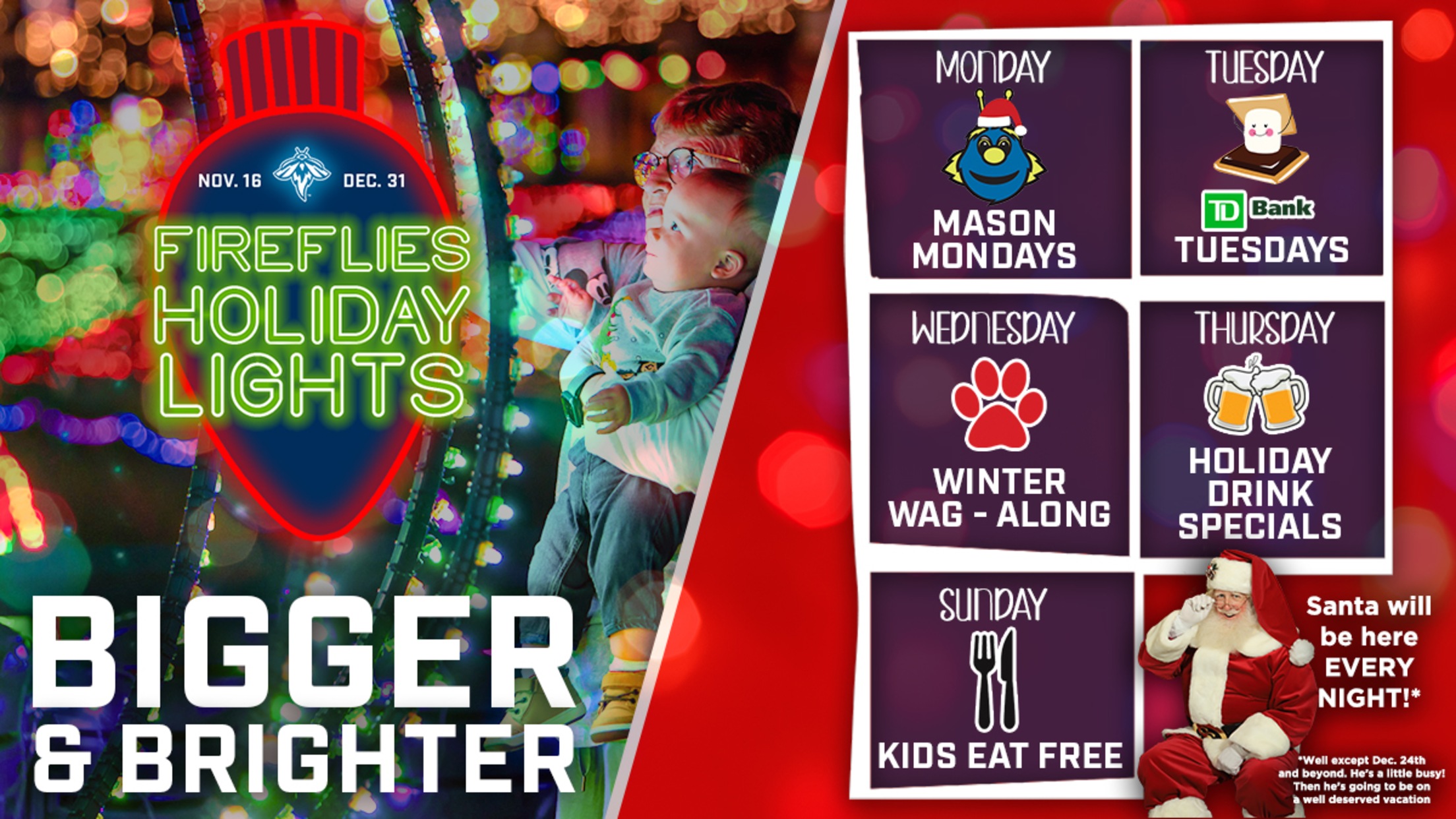 COLUMBIA, SC – The Columbia Fireflies today announced the promotional schedule for the 2023 Fireflies Holiday Lights season, happening at Segra Park November 16-December 31 for the second year.