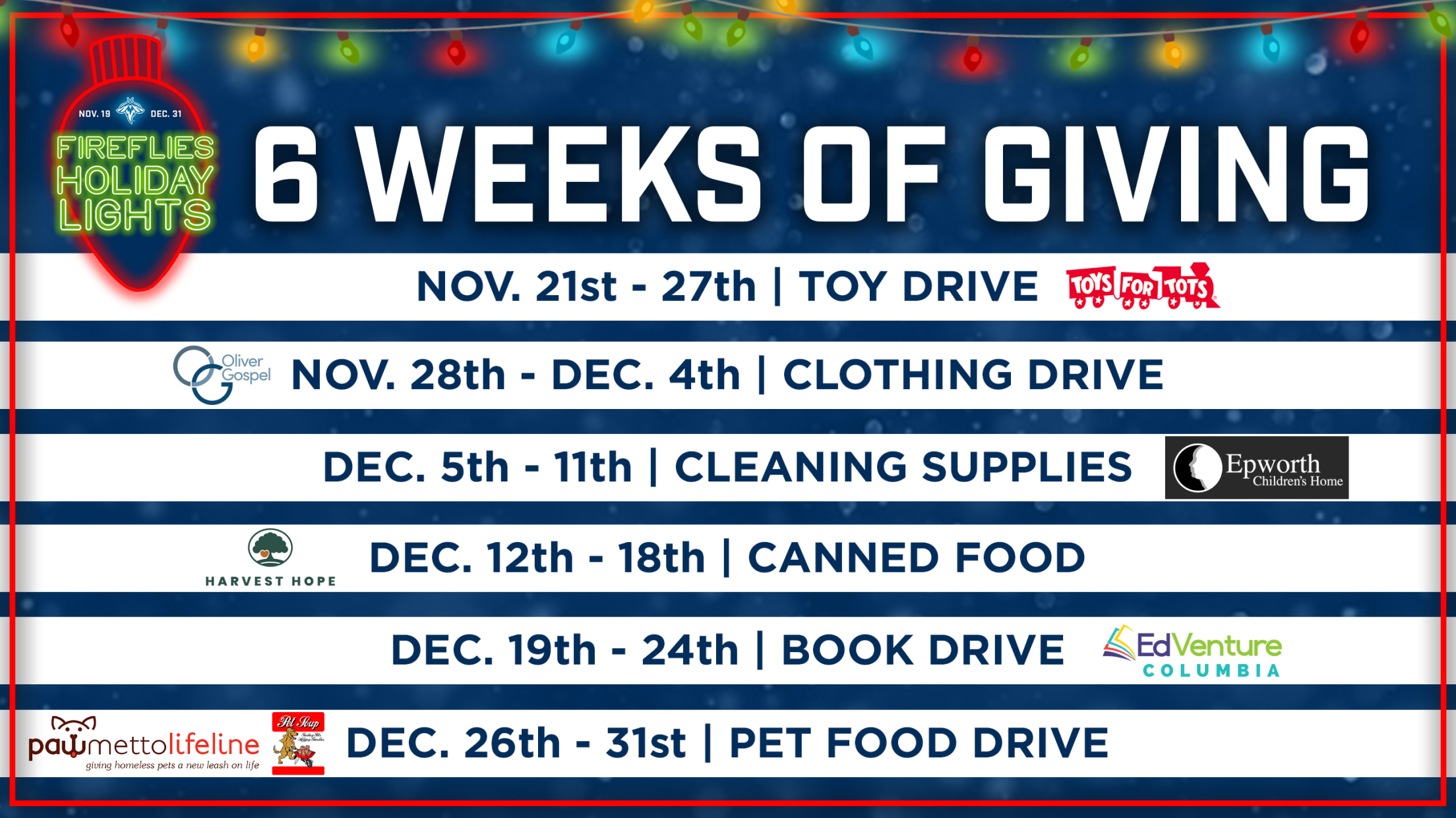 COLUMBIA, SC – The Columbia Fireflies today announced that they will host Six Weeks of Giving during Fireflies Holiday Lights. Six Weeks of Giving is a series of holiday drives benefitting six local community organizations. Each organization will host a week-long drive that guests can support by bringing donation items